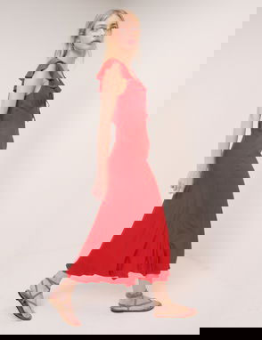 In full bloom. In all-over ditsy florals, this feminine midi dress features a lacy V-neck with tie detail and short puff sleeves. We love its easy, flowy silhouette.