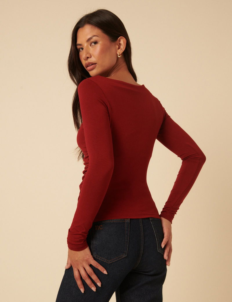 In burgundy red, this soft, jersey long-sleeved top features a boat neckline. The ruching through the body creates a flattering, close fit.