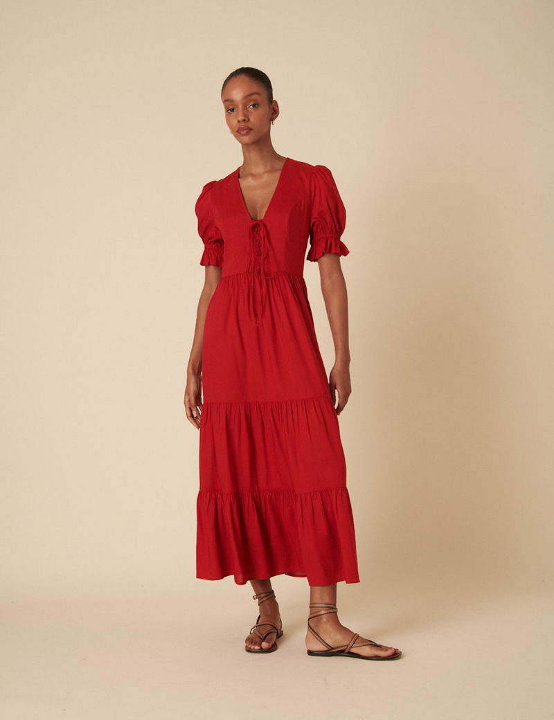 Red Tie Front Tiered Lia Midi Dress