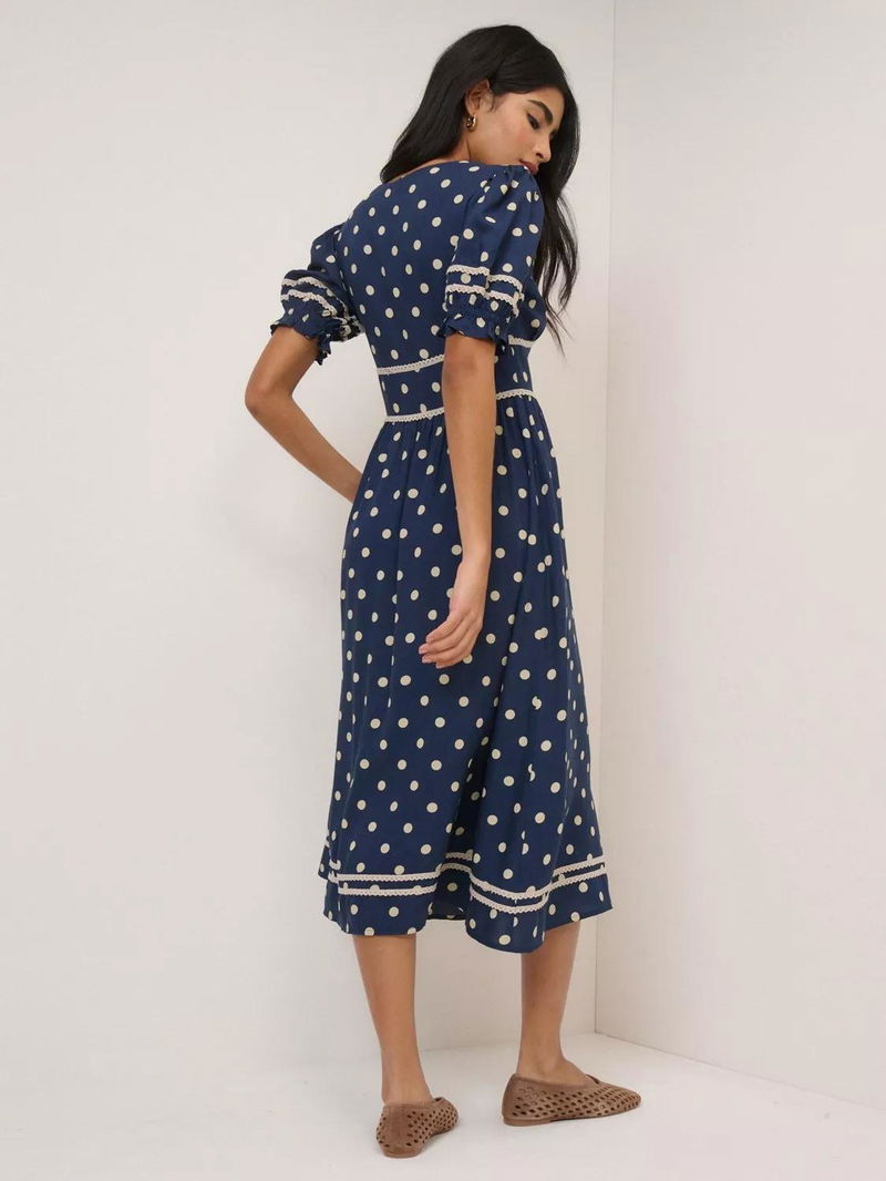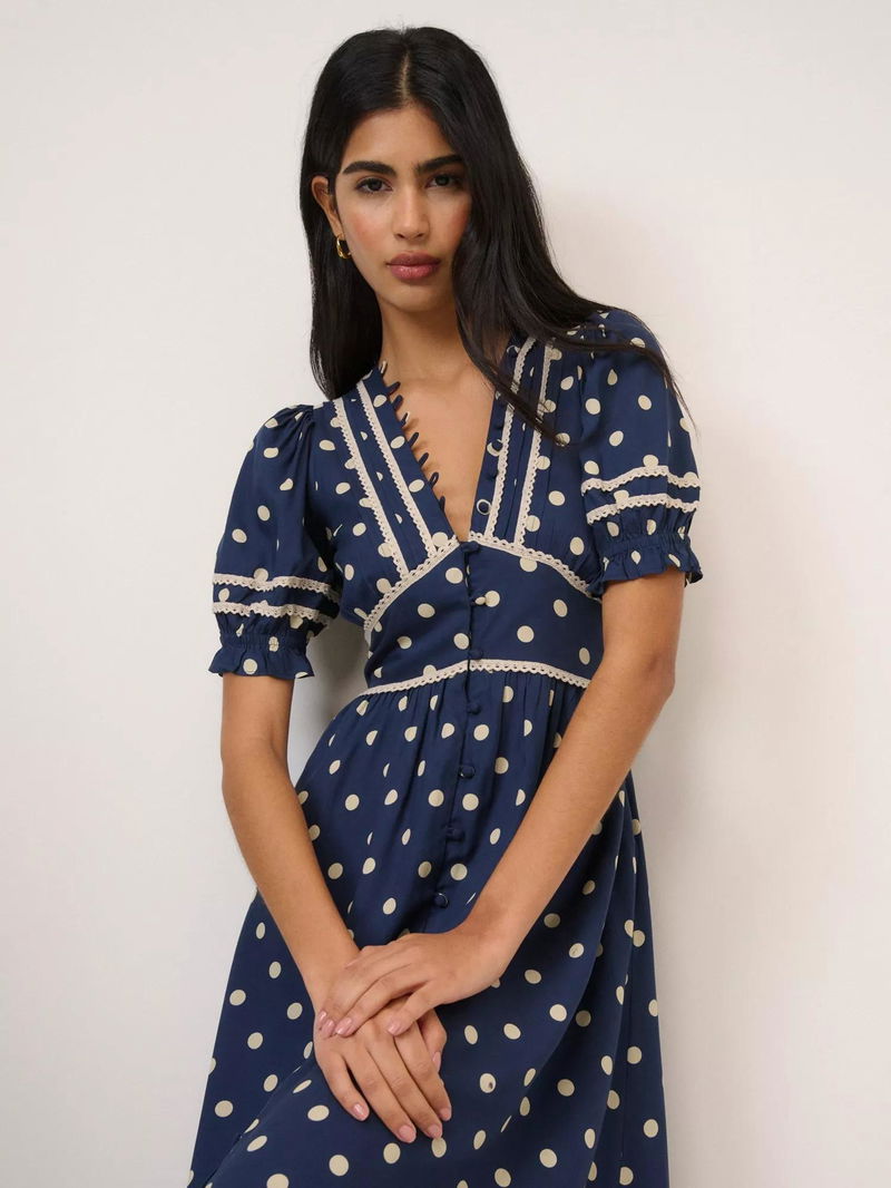 A dress with all the right details. Designed in-house with polka dots, the Saffy midi is framed by a V-neckline and button front, with intricate lace trims and pintuck detailing. The panelled waist shapes before falling into a relaxed skirt.