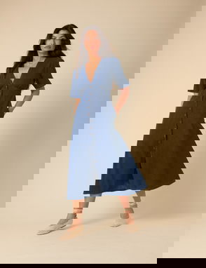 Dreamy denim. This mid-wash denim midi dress is the perfect wardrobe staple. It features a v-neck and a classic button front, and you'll wear it everywhere you go. Style yours with your go-to shoes. Organic cotton is grown without the use of chemicals such as fertilisers and pesticides, helping to support healthier and more sustainable farming practices.