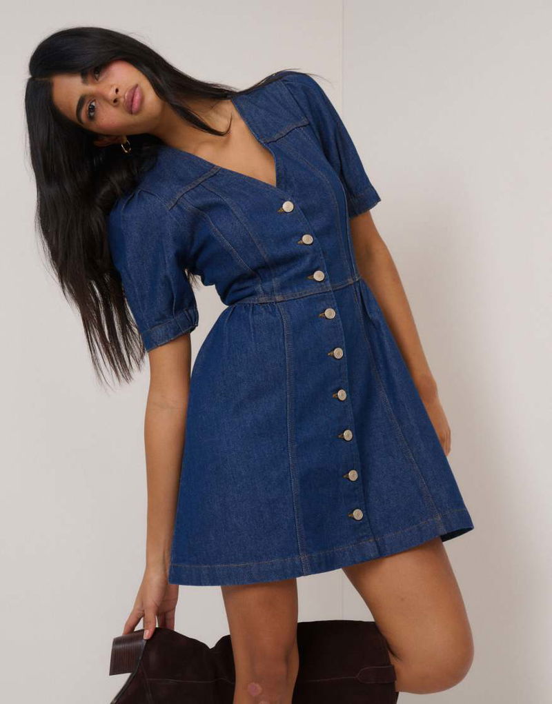 Short Sleeve Denim Fit And Flare Mini Dress In Blue