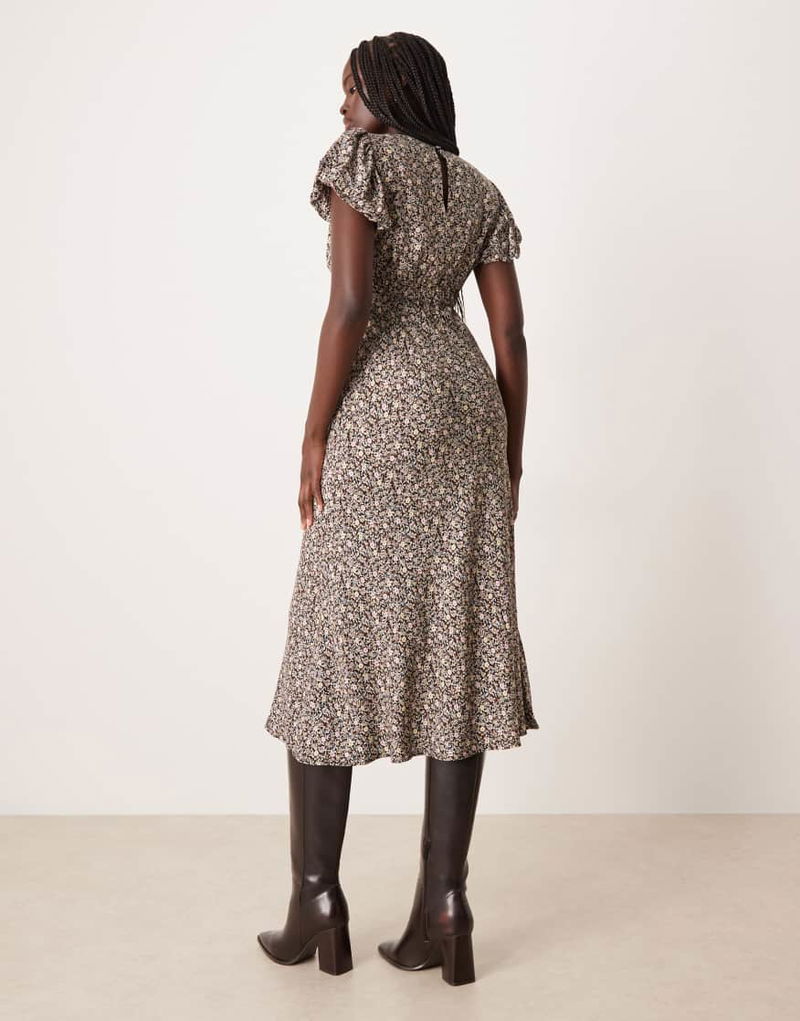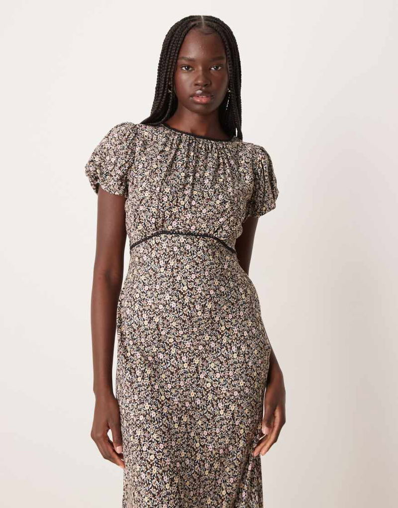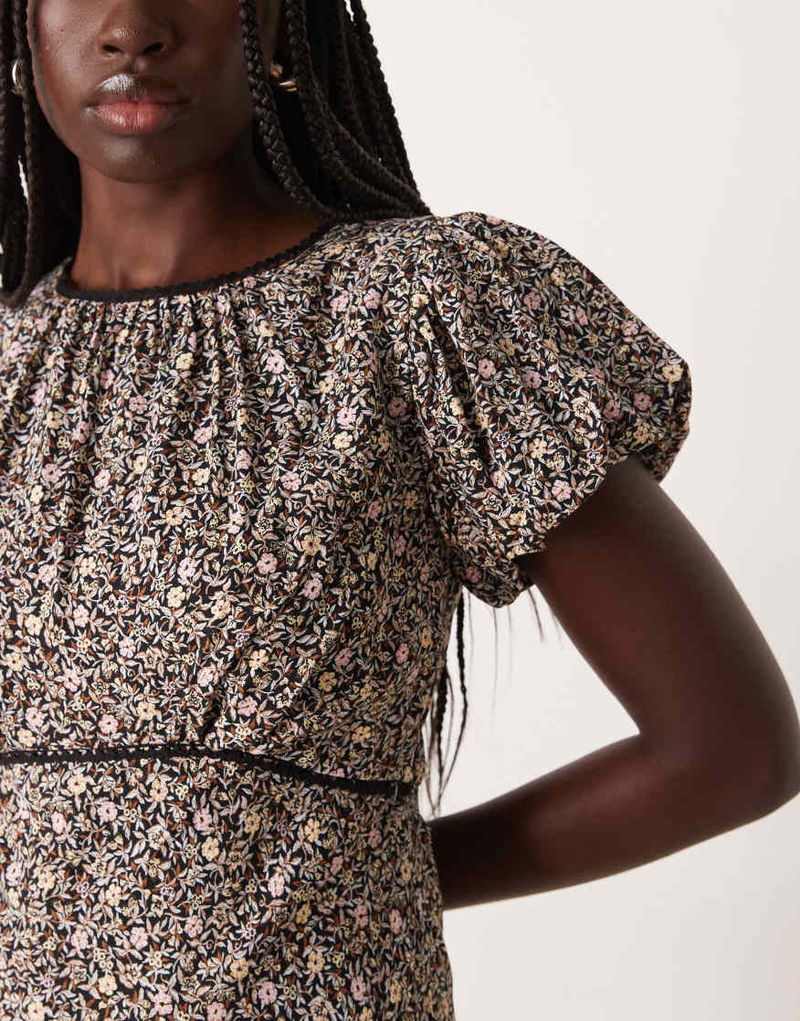 Sicily Gathered Ruched Neck Puff Sleeve Midi Tea Dress In Black Floral Print