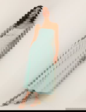 This denim midi dress features a V-neckline and short sleeves. The fitted bodice nips the waist before gently flaring to a relaxed A-line skirt. It's finished with metallic-tone buttons and neat seams. V-neck Metallic-tone button front Short sleeves A-line shape Size tip: we recommend your usual size Due to the nature of this product, colour may transfer onto lighter fabrics and surfaces