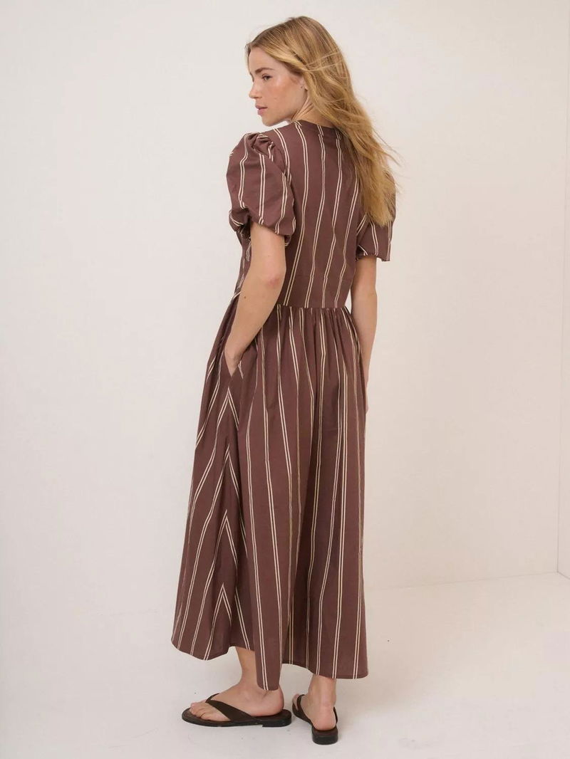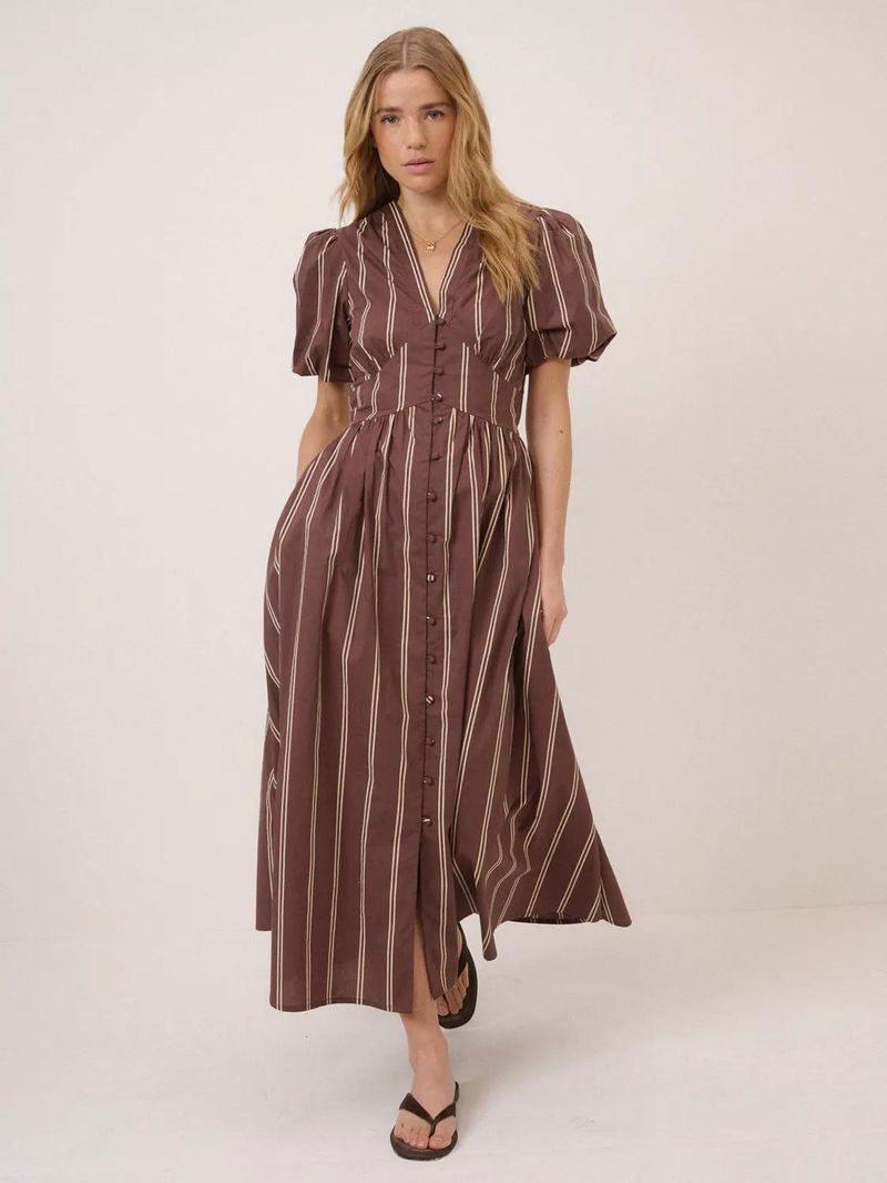 Crafted from soft seersucker, this striped midi dress features a feminine V-neckline and buttons through the front. The panelled waist softly shapes the bodice before falling into a relaxed skirt with a subtle front slit. Don't miss the pockets.