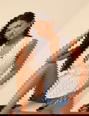 This sleeveless swing top is cut with a boxy, relaxed fit and finished with floral cutwork embroidery at the scalloped hem. Wear with the matching shorts or with denim.