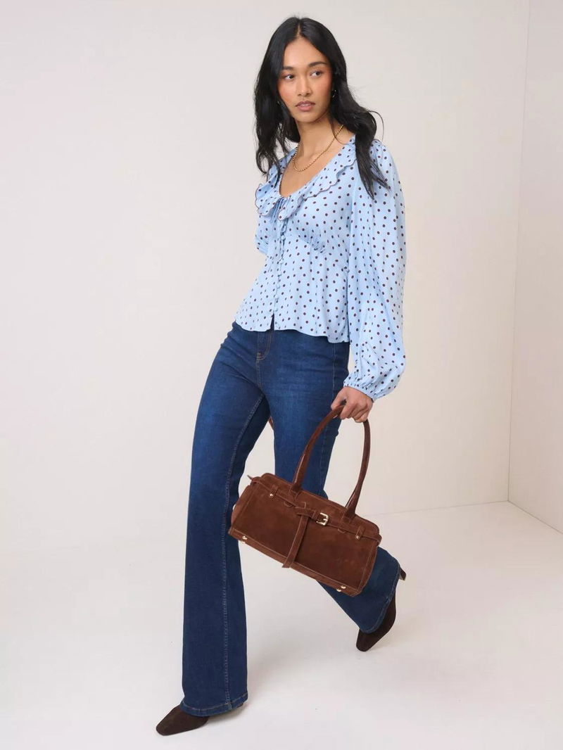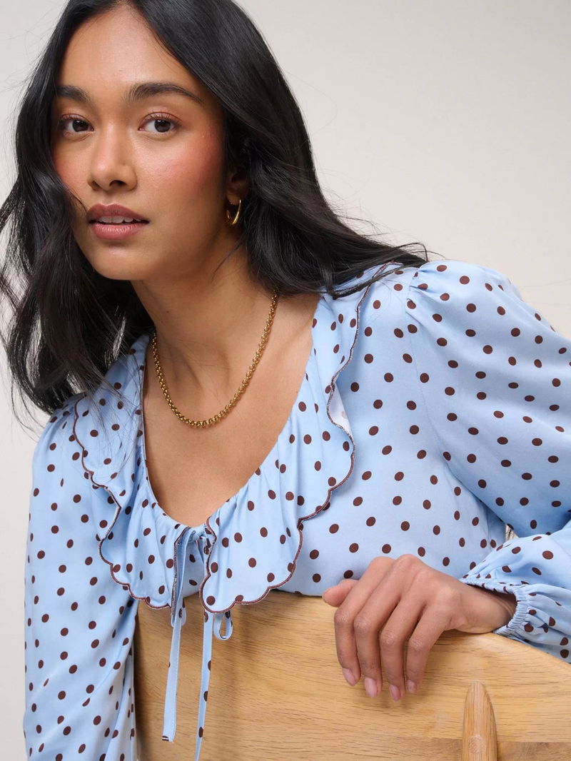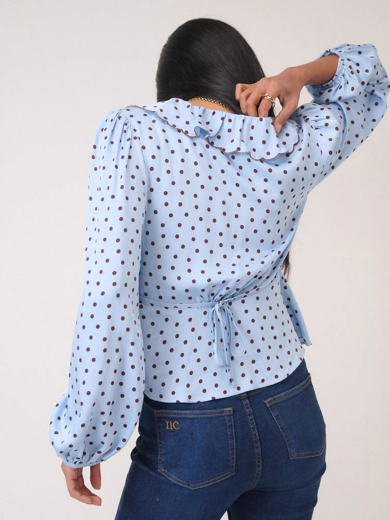 This polka dot satin top features a ruffled V-neckline with a tie detail and long balloon sleeves. Underbust seams and a tie-back detail shape the bodice for a tailored profile that falls to a relaxed hem.