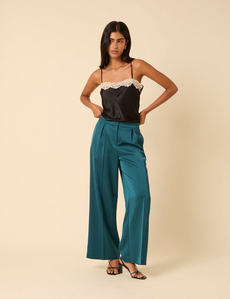 Coming in teal, these satin trousers sit high on the waist with front pleats that fall to a fluid wide leg. They're finished with a seamless hook-and-bar fastening.