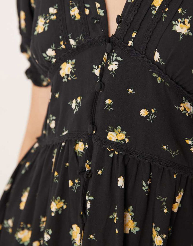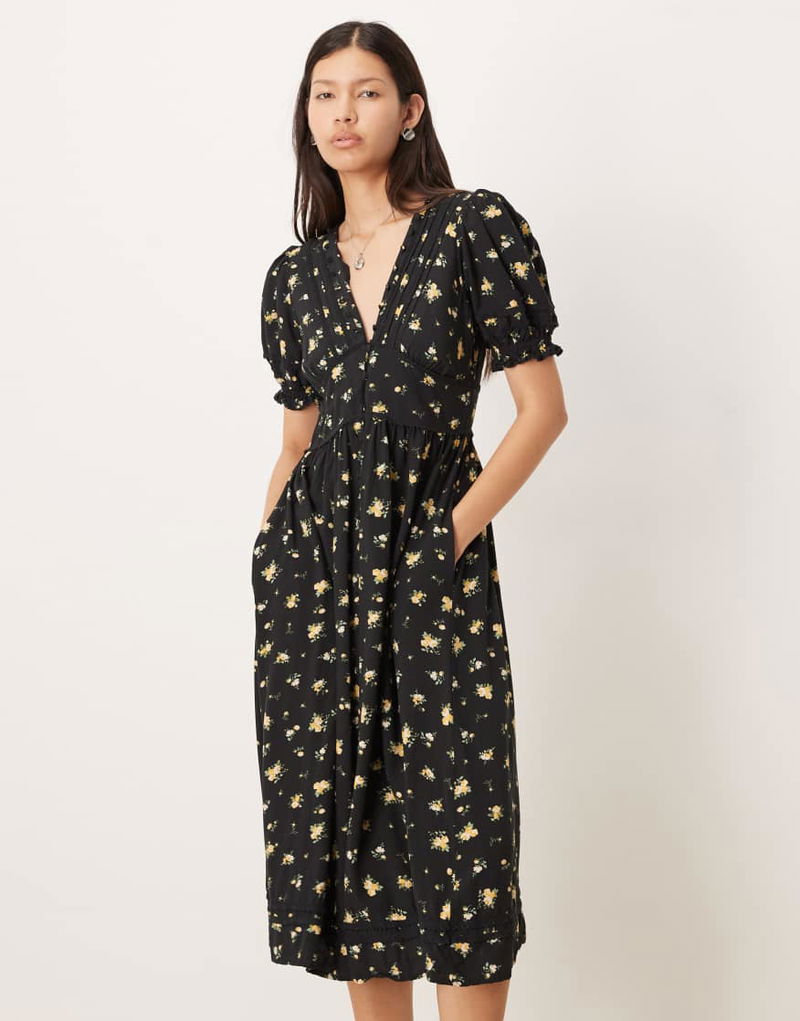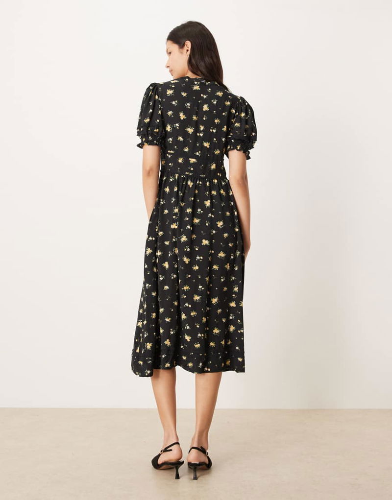 V Neck Puff Sleeve Button Front Midi Dress In Black Floral Print