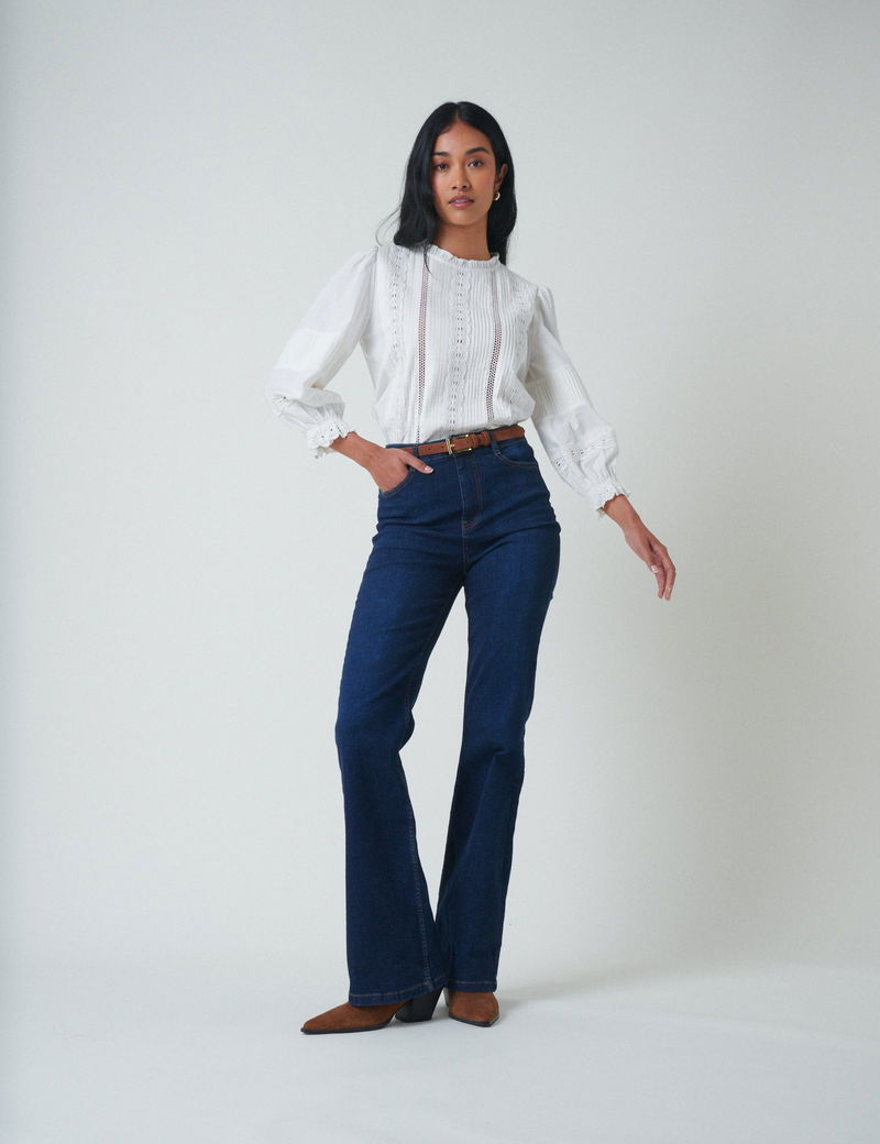 This white blouse features a frilled high neck and cropped balloon sleeves with a lace trim. Cut to a relaxed fit, it's finished with lace ladder trims and pintuck detail for premium texture.