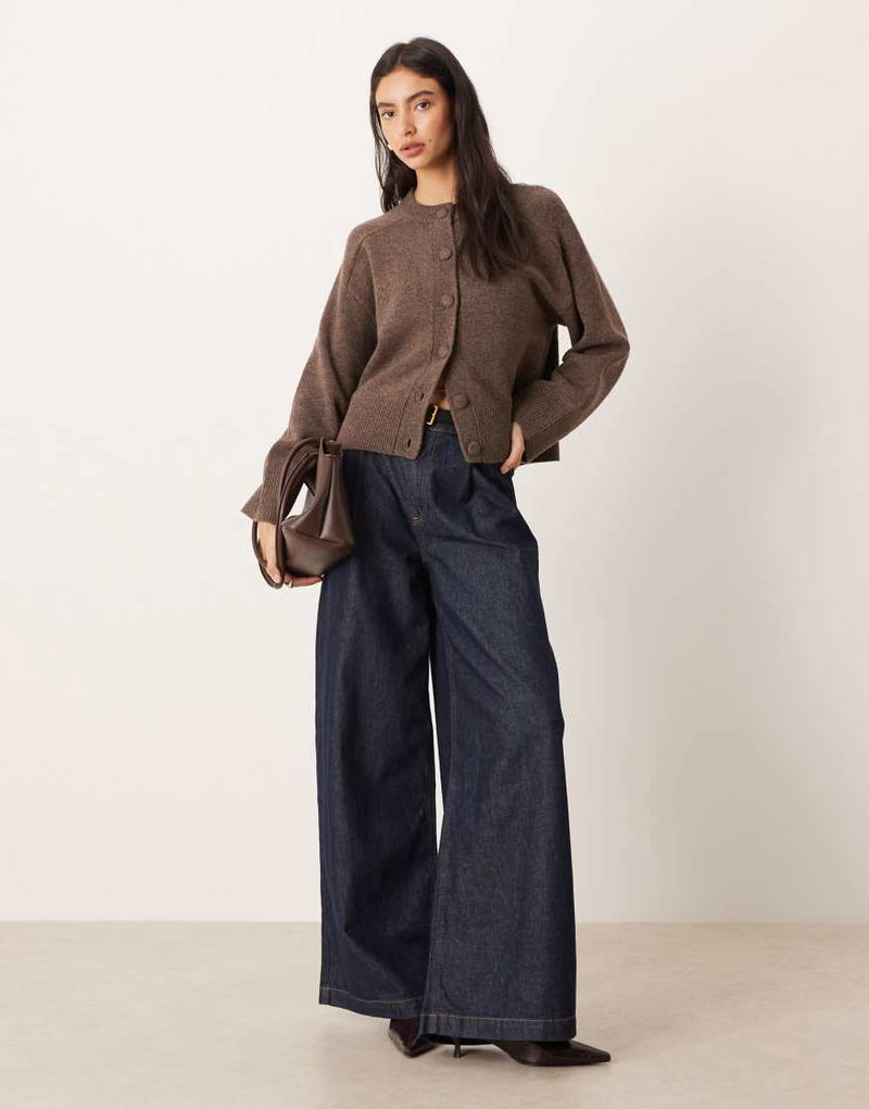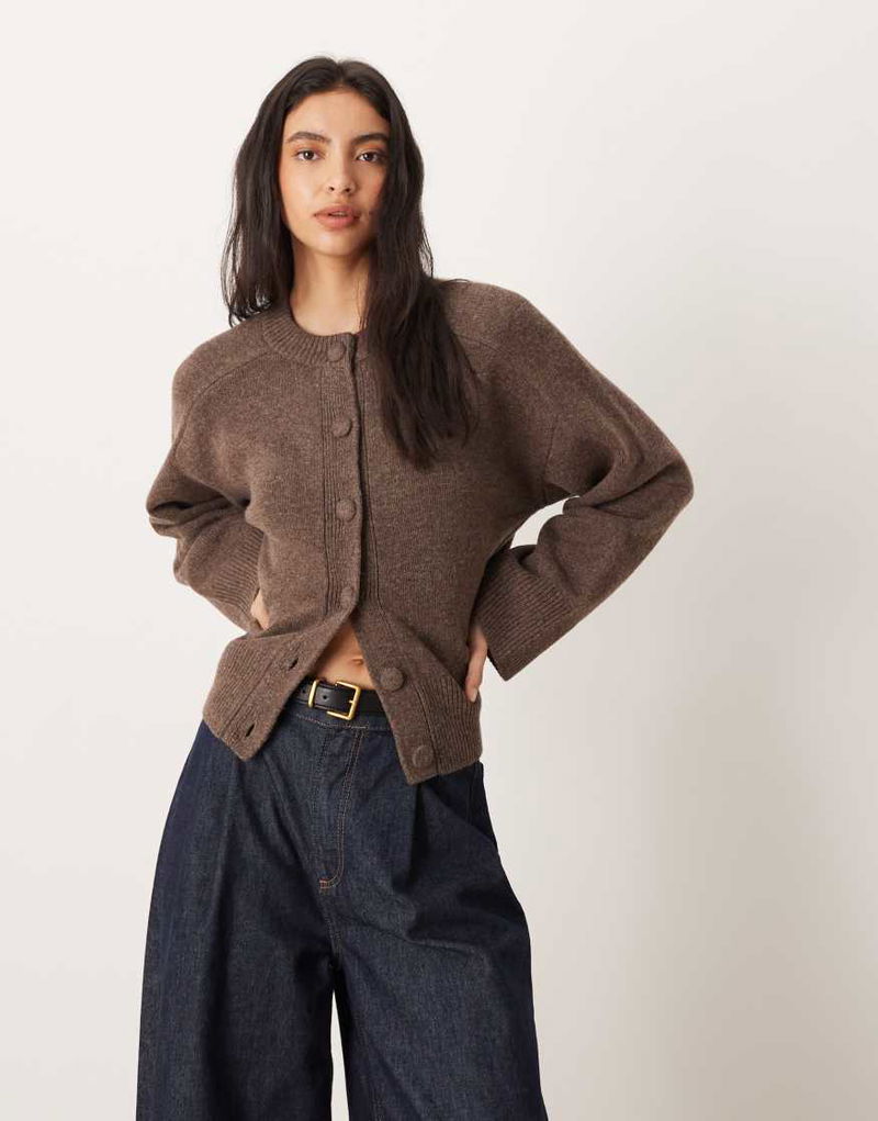 Wool Crew Neck Cardigan In Brown