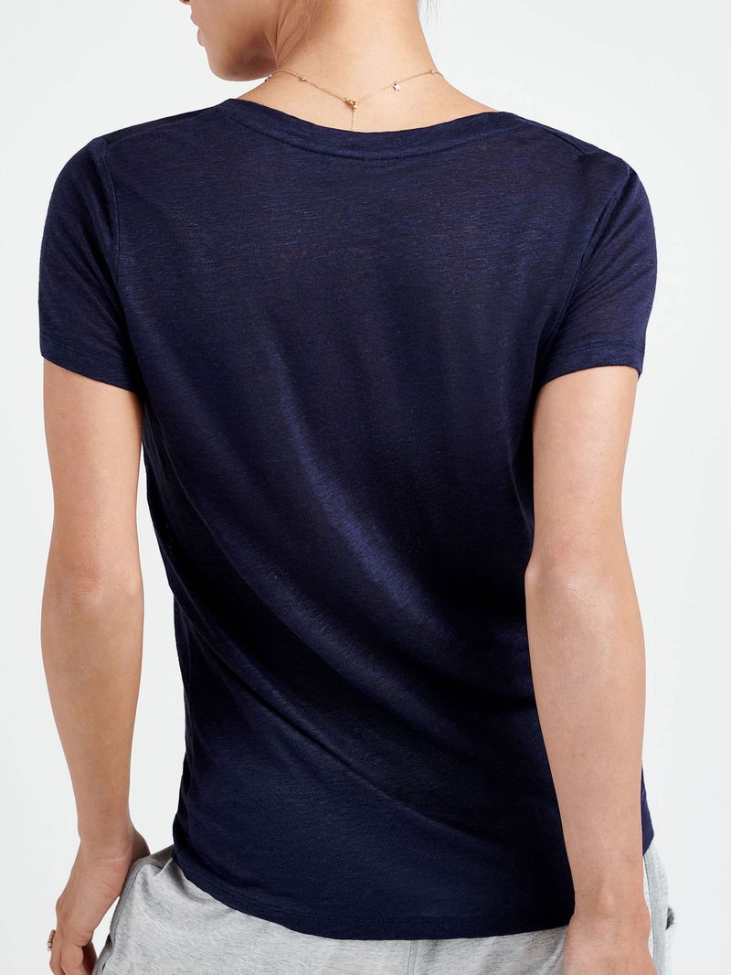 The perfect T shirt shape, for everyday, in 100% breathable linen jersey, with natural drape, semi transparency and light slub texture.