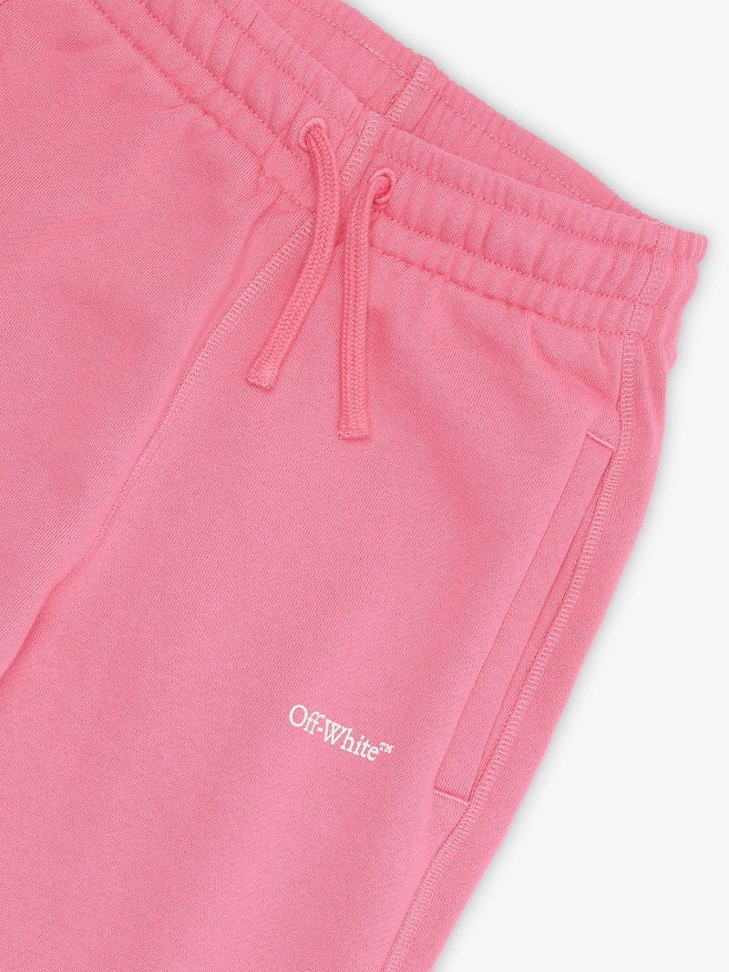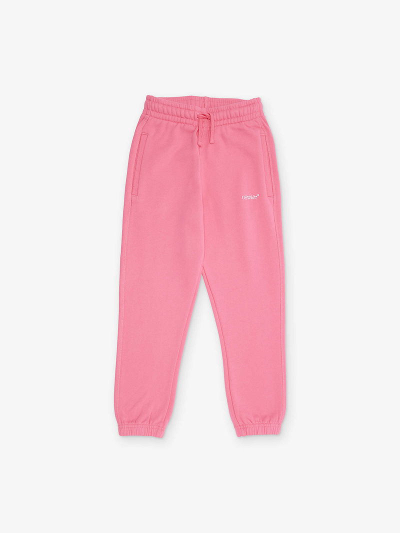 Off-White c/o Virgil Abloh cotton joggers. Relaxed fit, mid-rise, elasticated drawstring waist, two slip pockets at sides, brand print at front, ribbed trims.