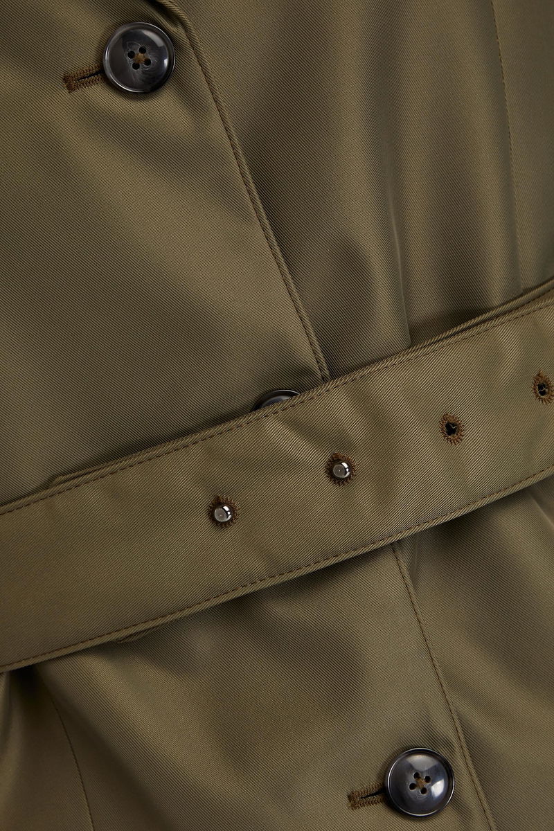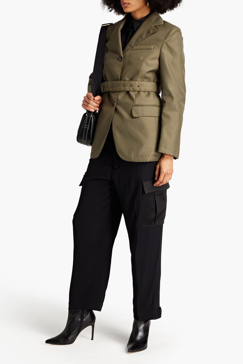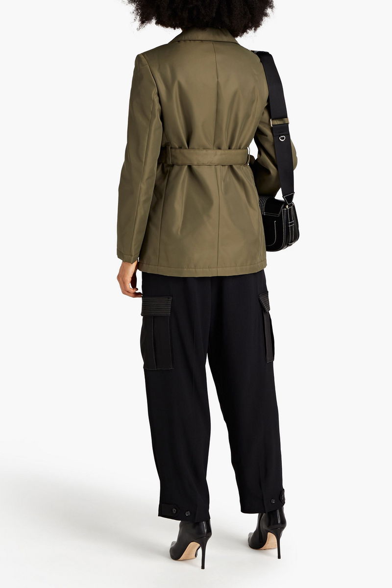 Jacket. Shell. Padded. Darted bust. Shoulder pads. Belt loops. Detachable belt. Breast pocket. Two side flap pockets. Button fastenings through front. Fully lined. Non-stretchy fabric. Mid-weight fabric.
