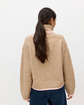 Brightly coloured jumper knitted in a striped geometric design in shades of blue, pink and orange with ribbed trims.
