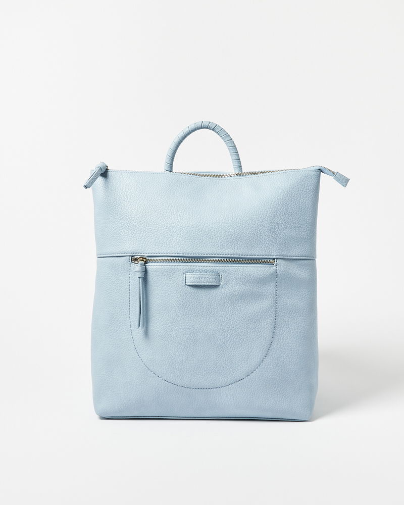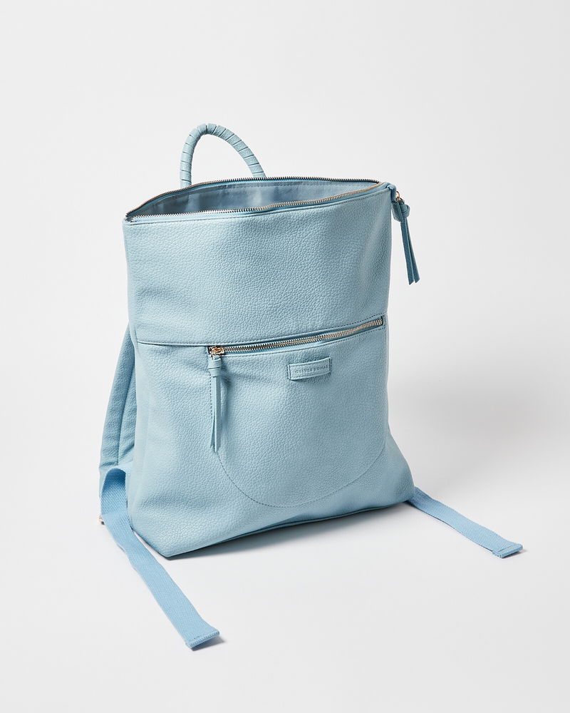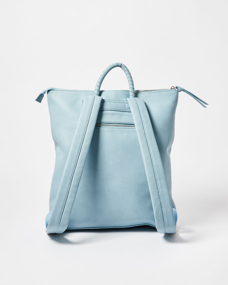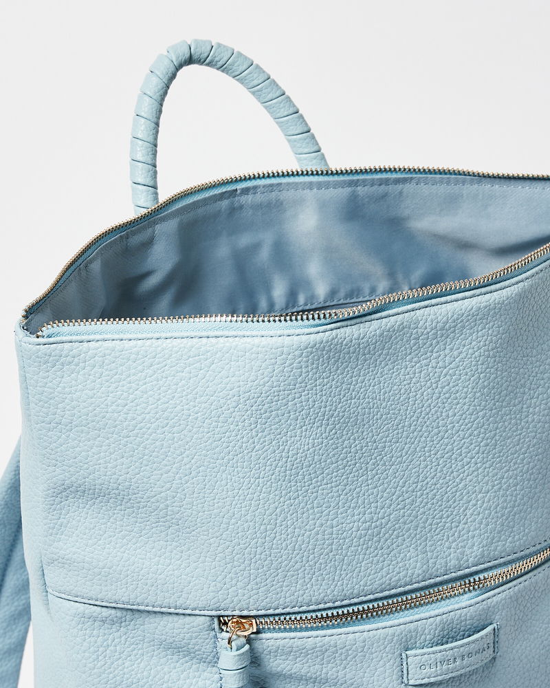 In a classic rectangular silhouette, this rucksack pairs a warm, baby blue tone with a black & white spotty lining.