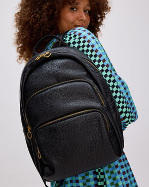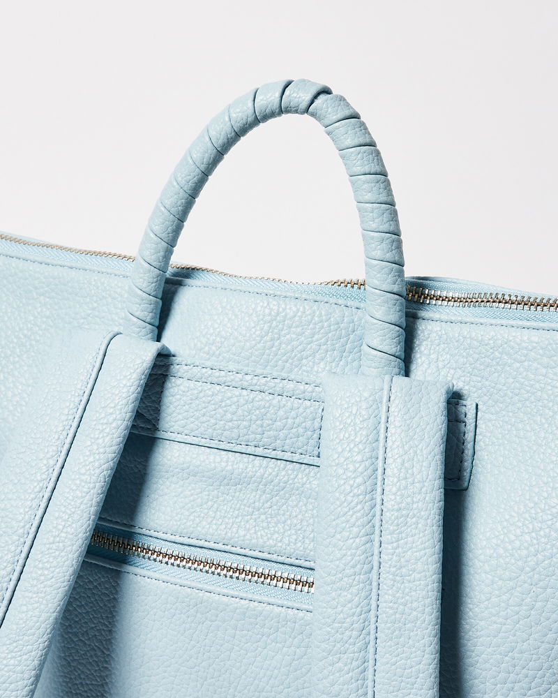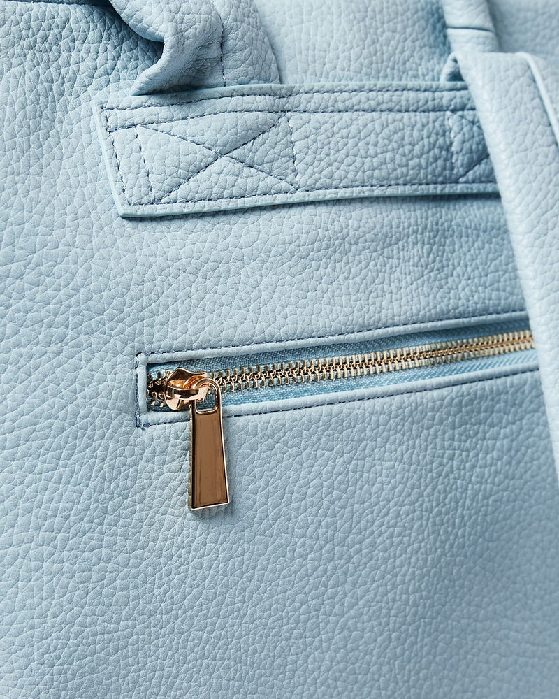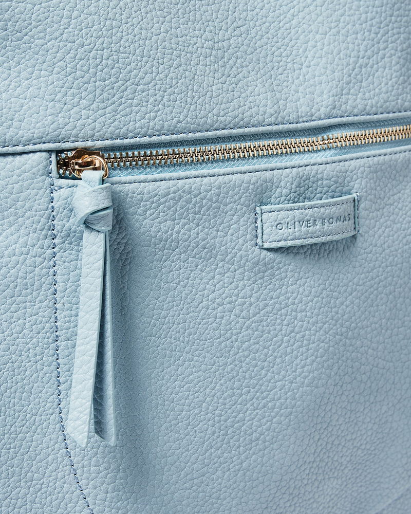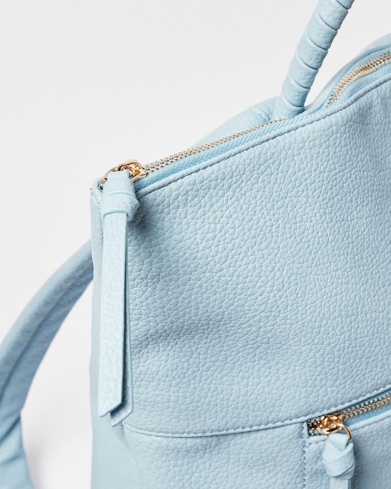 In a classic rectangular silhouette, this rucksack pairs a warm, baby blue tone with a black & white spotty lining.