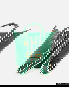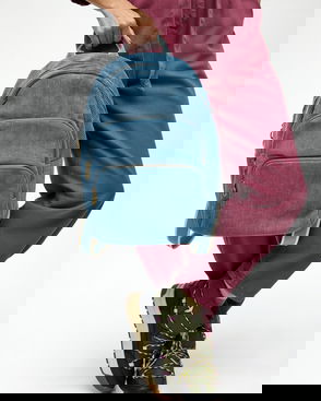 Teal green rucksack with three exterior zipped pockets, internal laptop slot and carry handle.