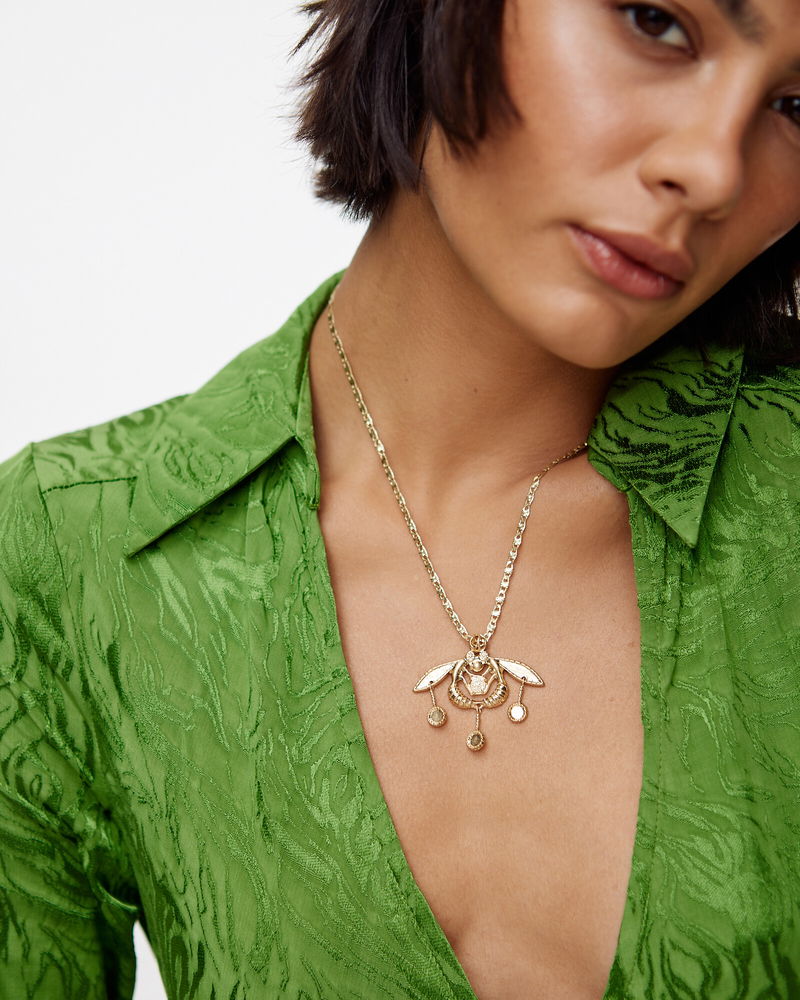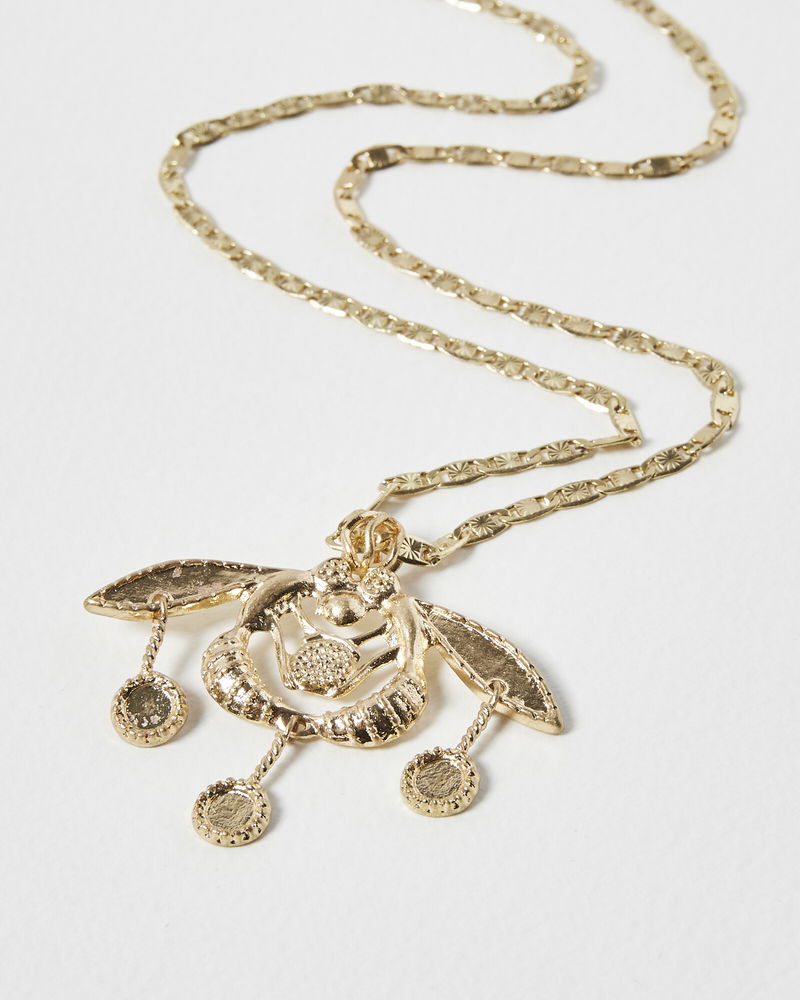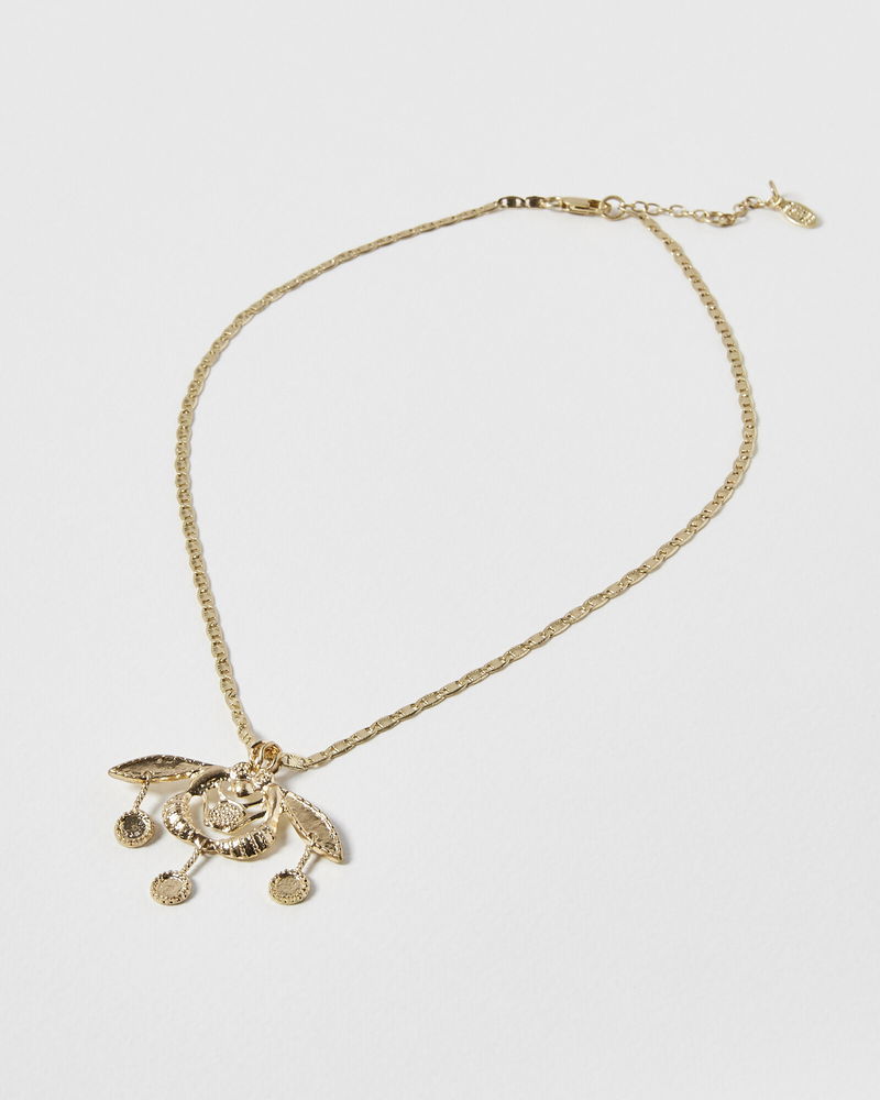 In a dramatic profile, this pendant necklace is finished in a shiny gold and suspends a statement bee charm inspired by Grecian designs.