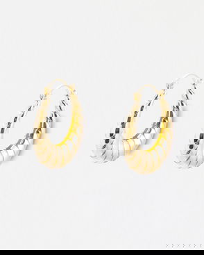 Gold-toned hoop earrings with a stud earring back in a flat, low hanging design. Engraved with small lines on the front for a textural surface finish.