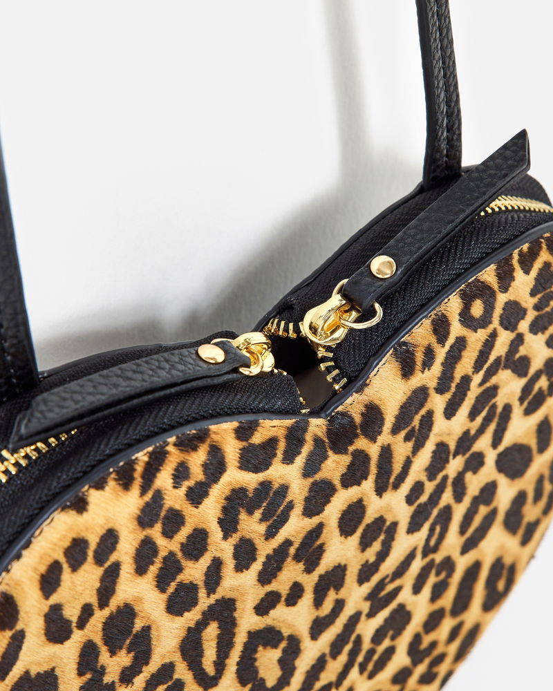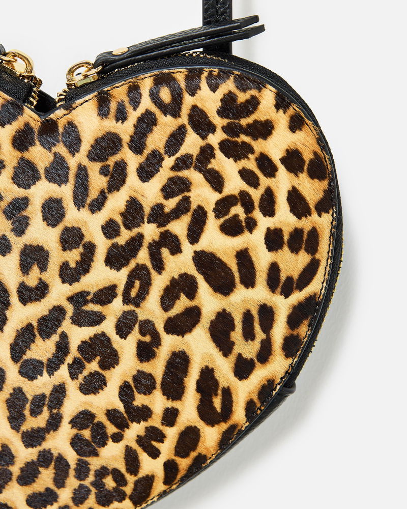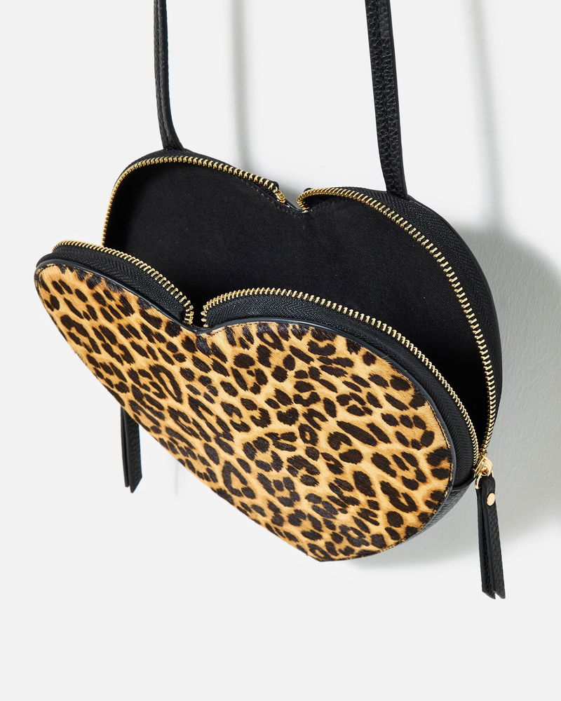Hearts and leopard print - what's not to love? This heart-shaped bag has a front panel in bold textured leopard print and a reverse side in sleek black, so you can switch sides to suit your outfit. With two zips that meet in the middle, it's perfectly sized to hold your essentials, making it ideal for Christmas parties or special occasions.