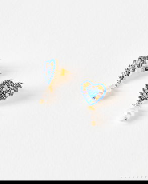 Large statement earrings in a heart shaped profile on a gold-toned metal base, with a stud back for ease of wear. These heart earrings a decorated with multicoloured stones in blue, pink and white hues, in a variety of shapes and sizes for a textural, cluster effect. Style with your evening and party looks for a colourful, statement look that catches the light.