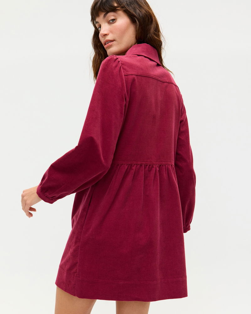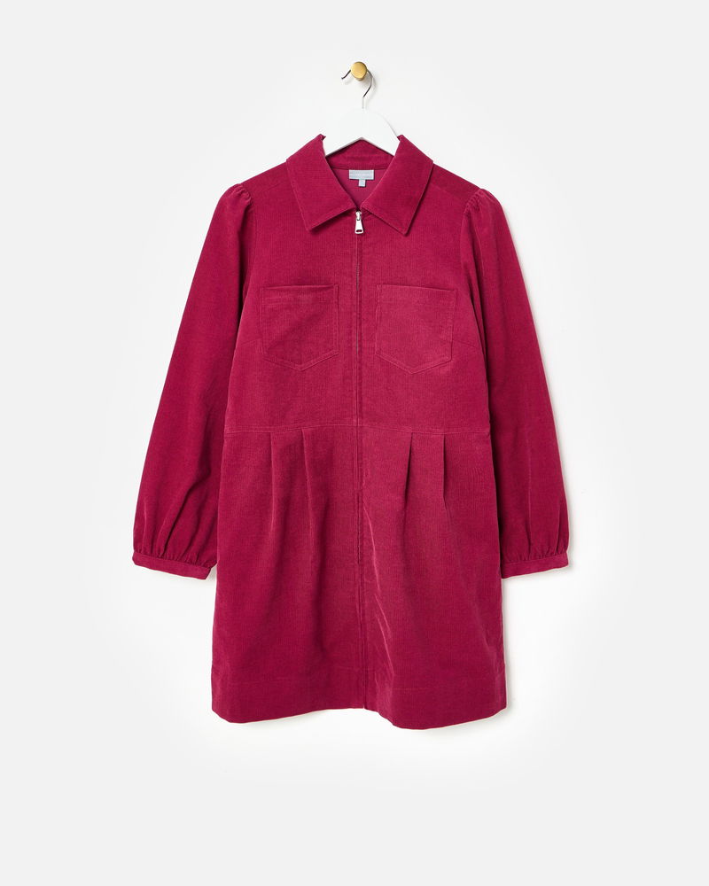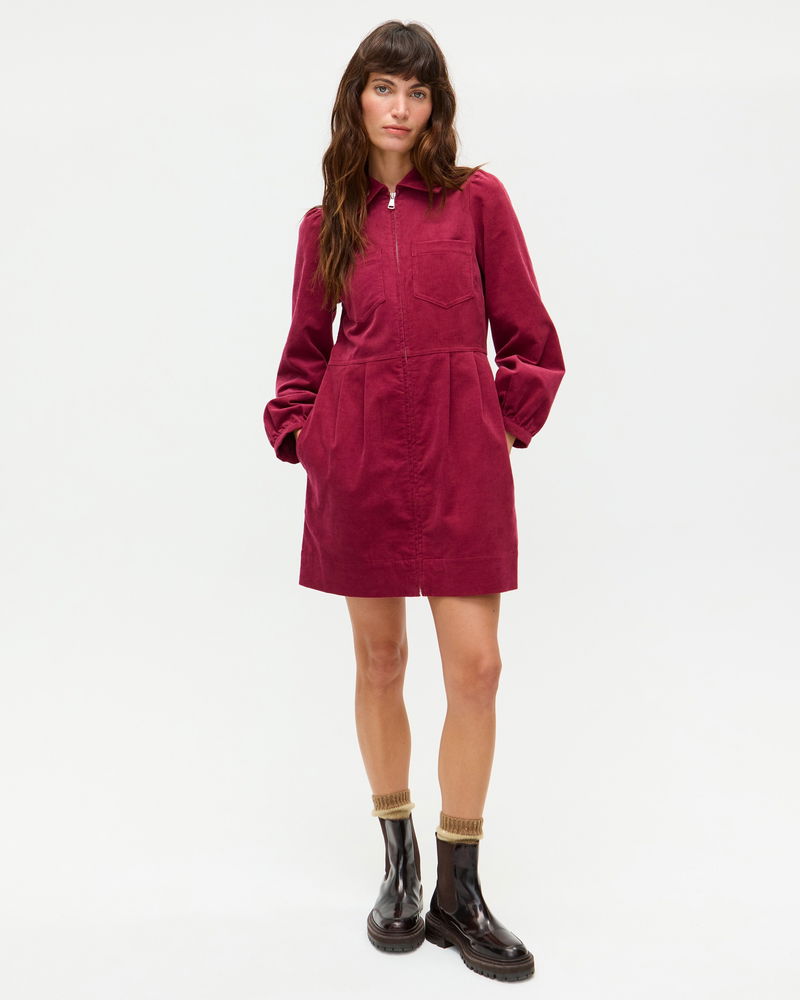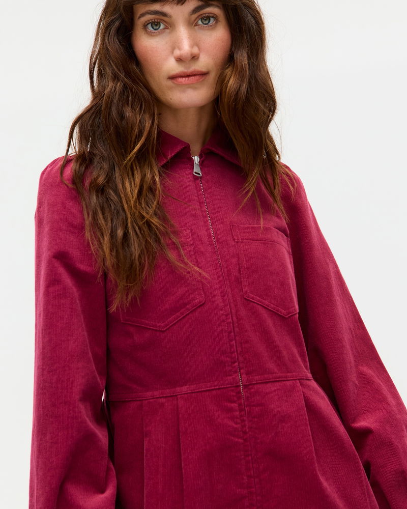 Berry Red Corduroy Zip Up Mini Shirt Dress