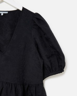 Looking for your next Little Black Dress? Our short-sleeve mini dress combines a simple, pared-back T-shirt cut with intricate feminine lace for a subtle-yet-sophisticated look. Designed in a loose, flowing shape for easy wear, we've added a scoop back that ties with an oversized black satin ribbon for a final flourish.