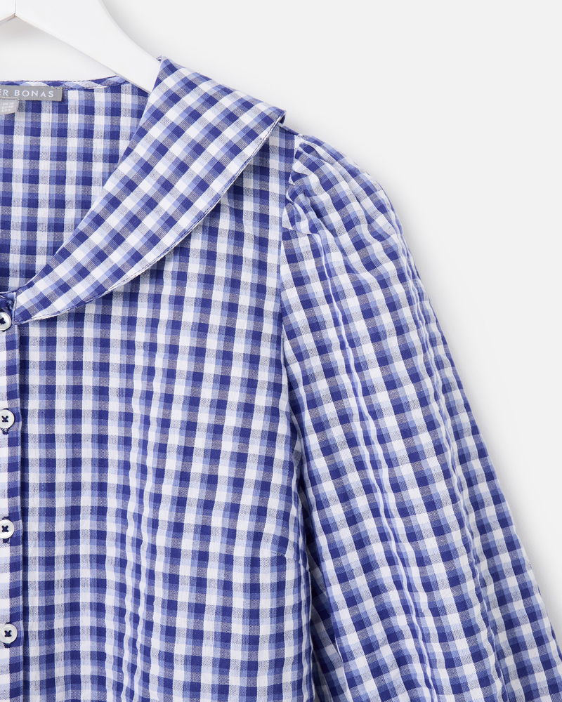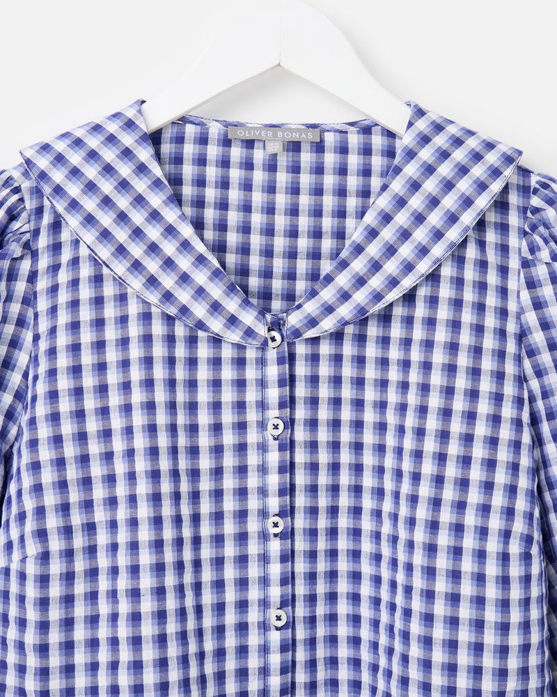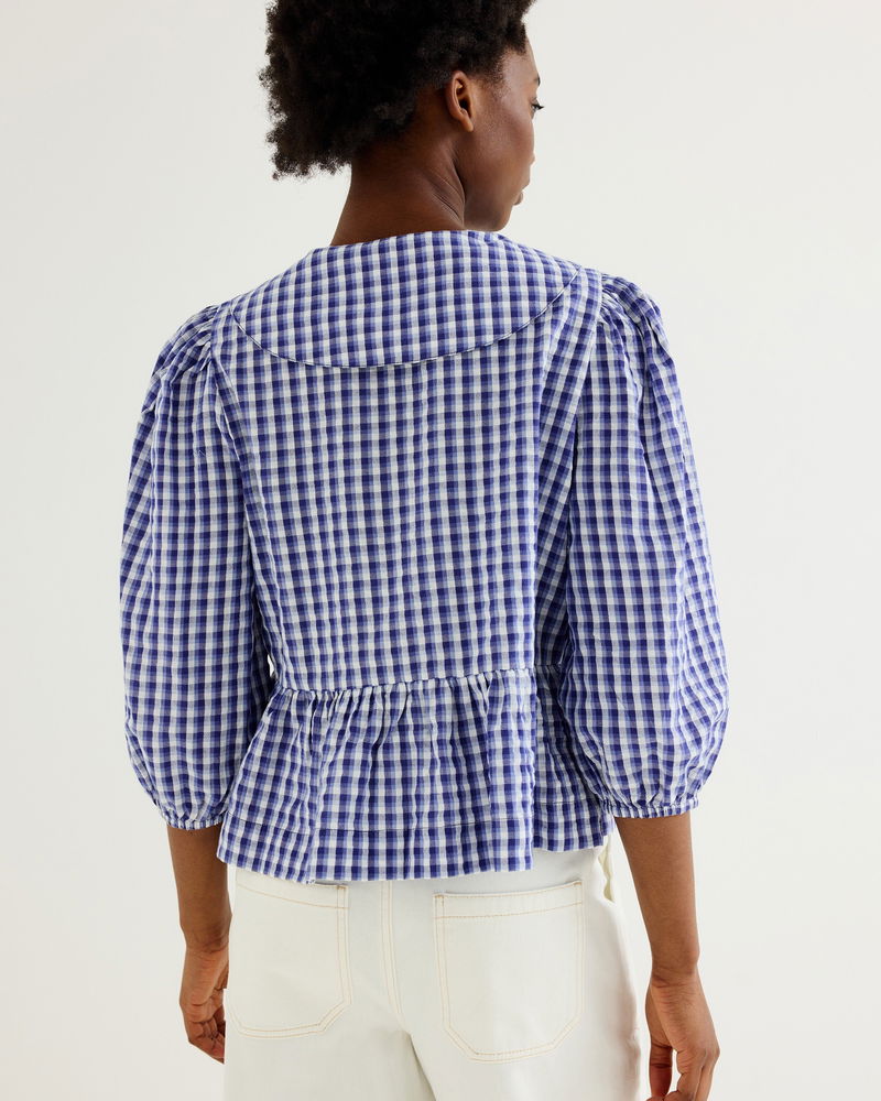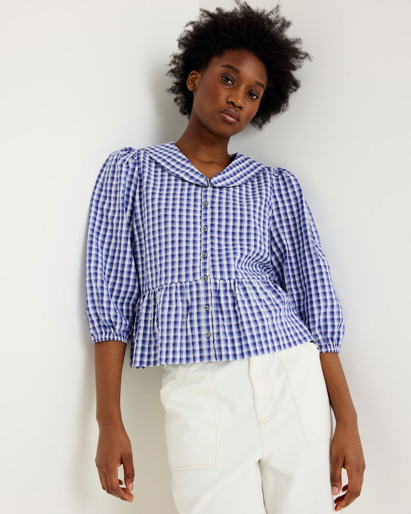 Blue & White Gingham Sailor Collar Cotton Peplum Blouse