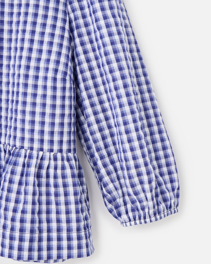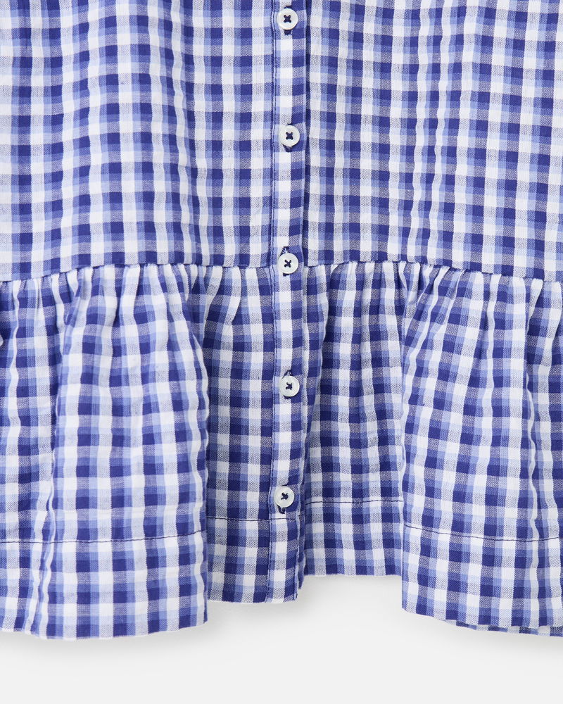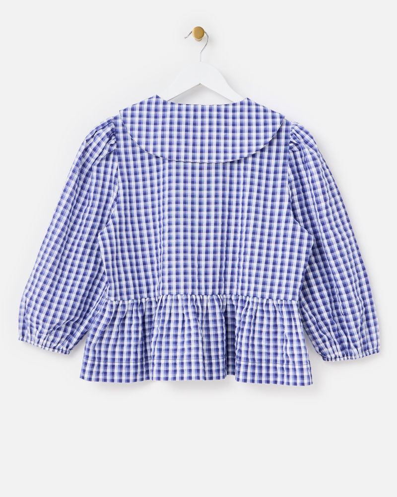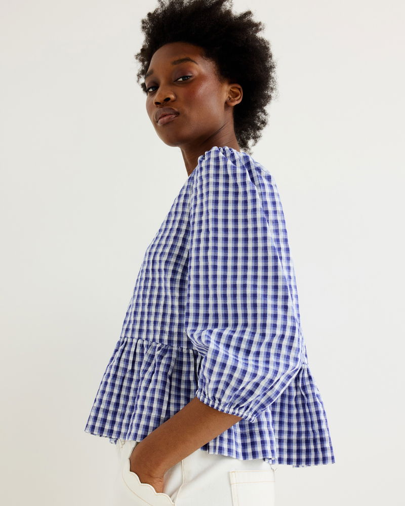 Blue & White Gingham Sailor Collar Cotton Peplum Blouse