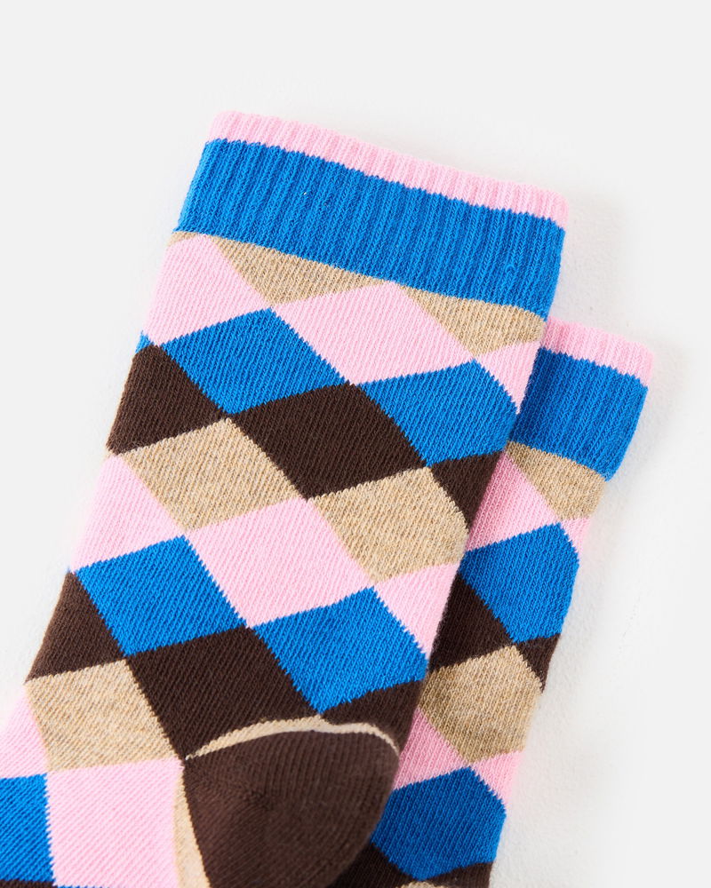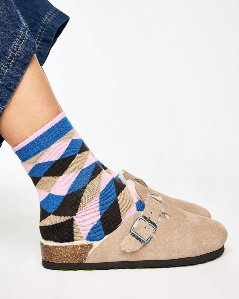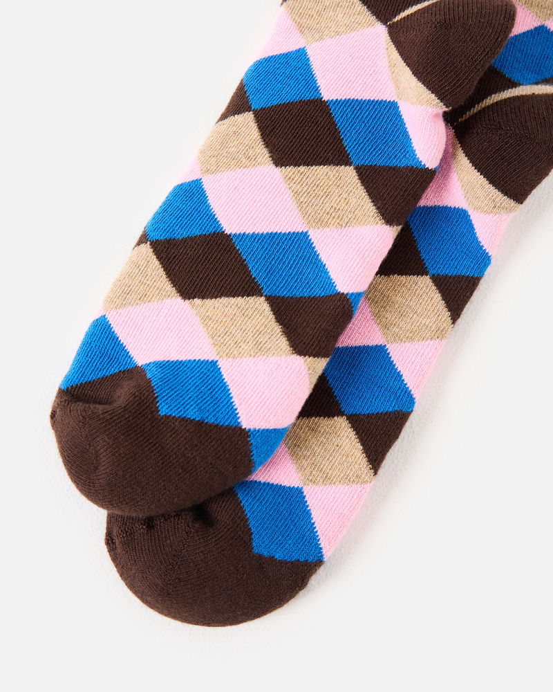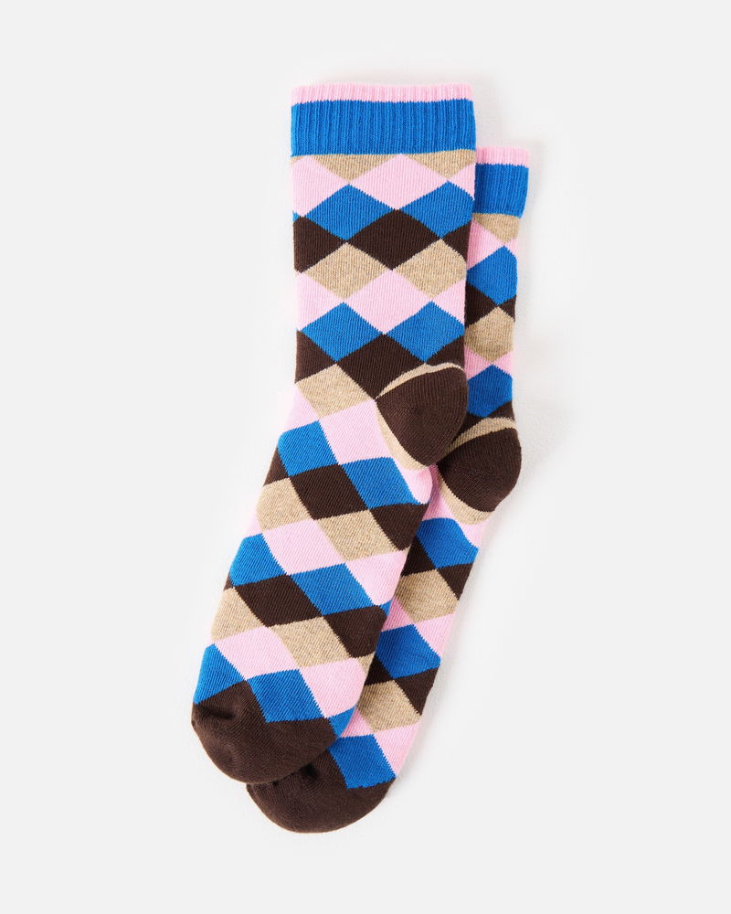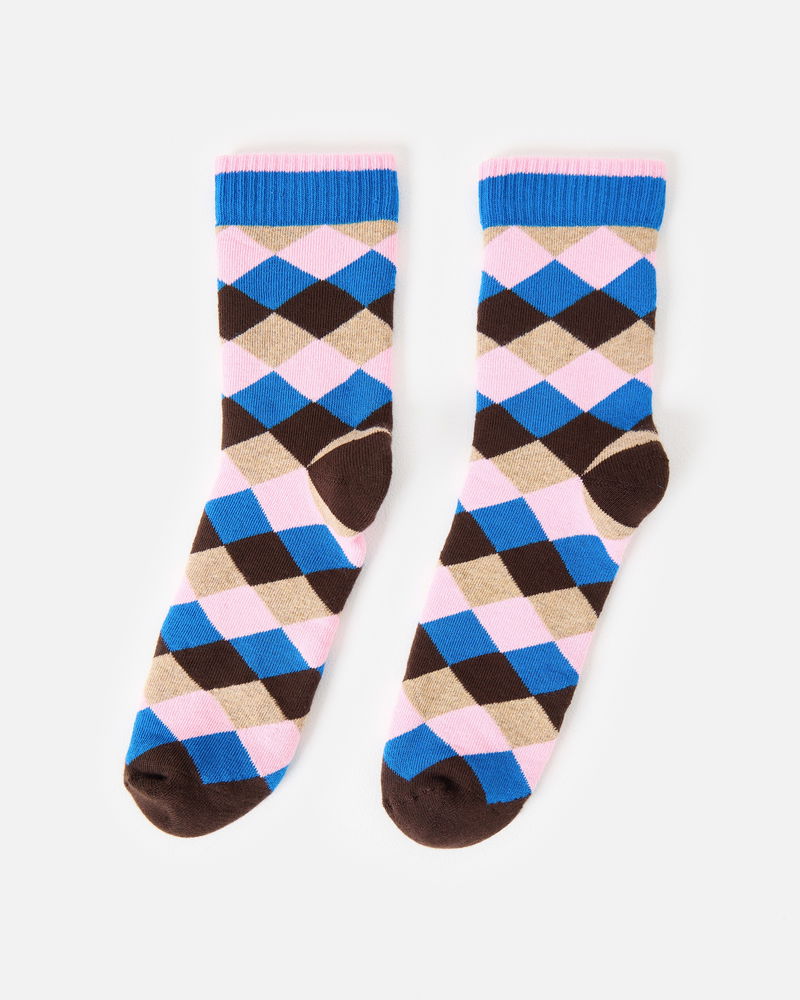 Because everyday basics don't have to be basic. Meet our ankle socks knitted with a diamond geometric pattern in tonal shades of blue, pink, cream and chocolate brown. Featuring solid brown toes and heels and ribbed trims, they're made for ankles that like to make their own statement.