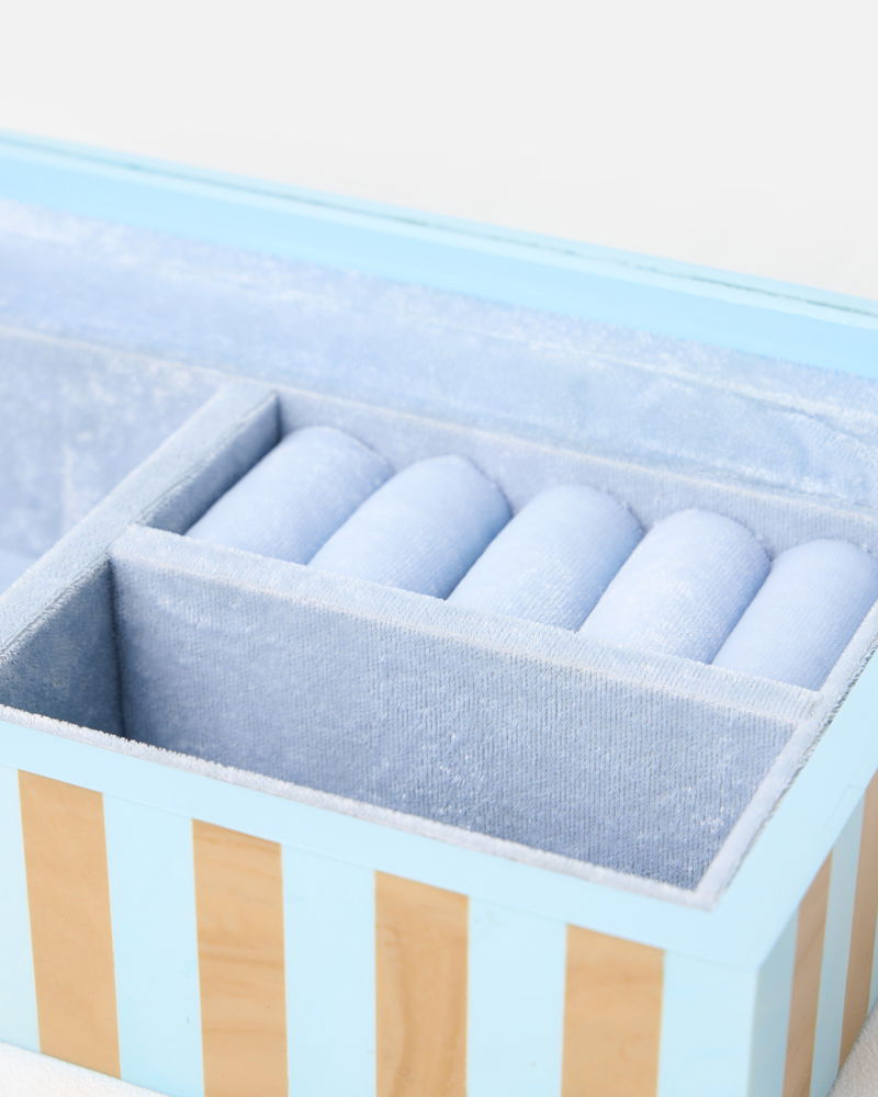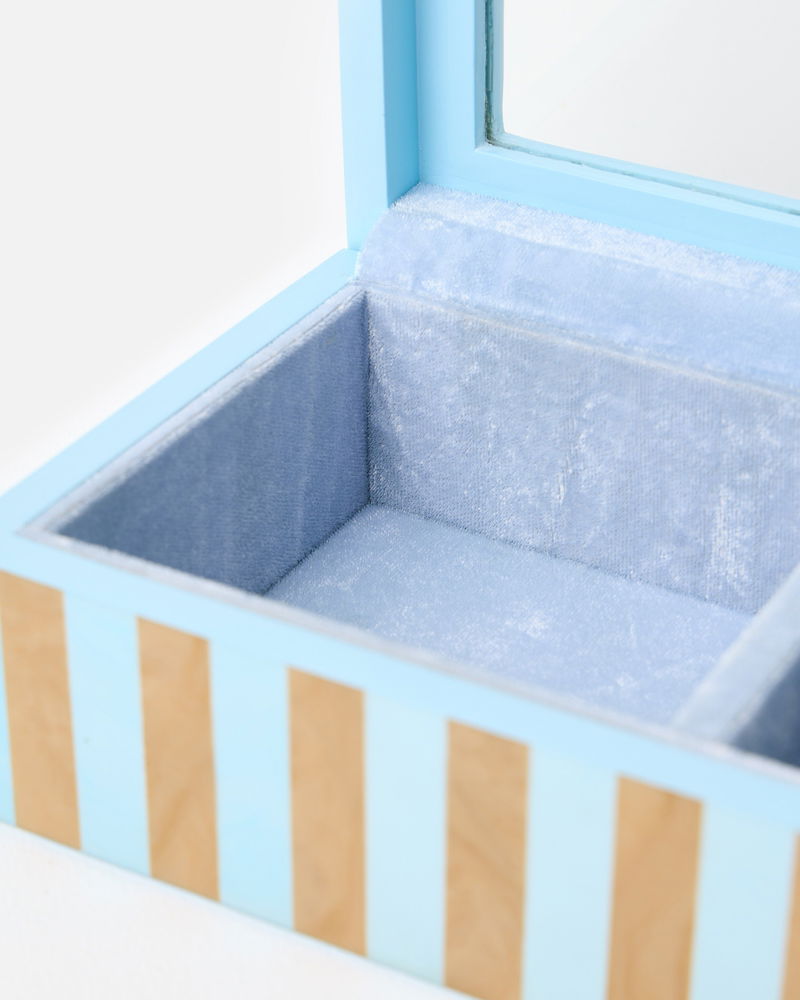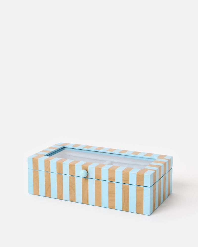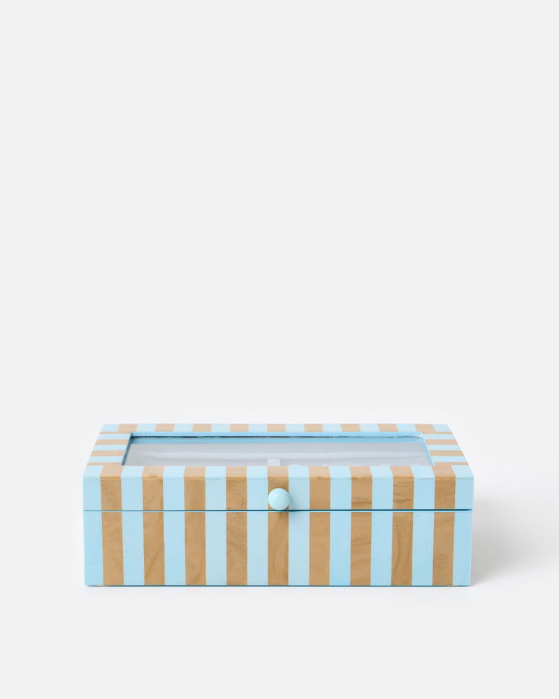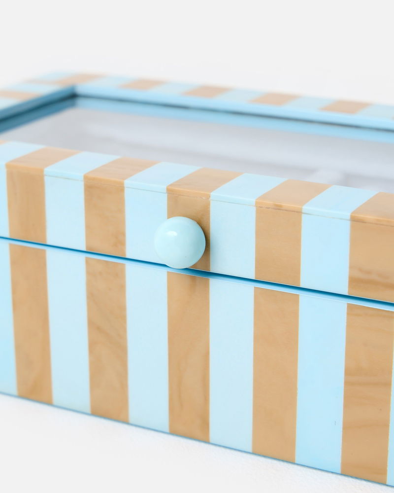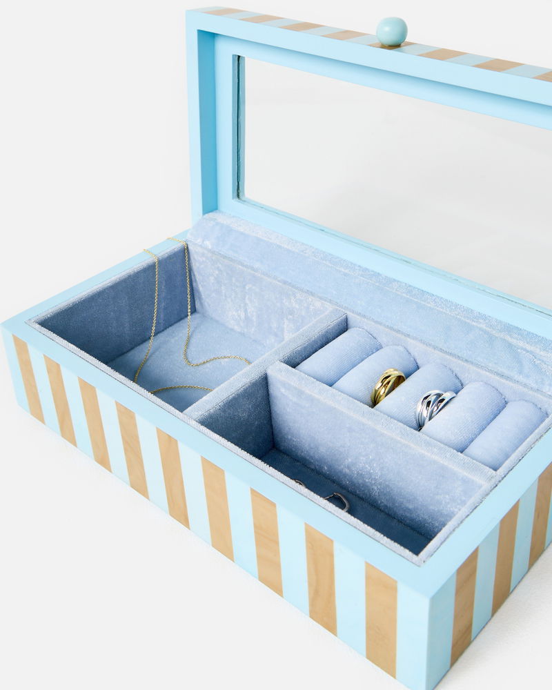 Perfect for organising a full jewellery collection, this large resin stripe box in blue and brown features a spacious left-hand compartment for larger pieces. The right side includes four velvet-cushioned ring holders and an additional lower compartment for smaller items. Topped with a clear lid and a rounded blue handle so you can easily view and access your jewellery.