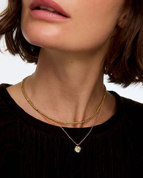 Colourful beaded layered necklace with a long and short chain, linked together at the neck with an adjustable lobster clasp. The short beaded necklace is strung with tiny beads in blue, green and pink hues, and the long pendant necklace features a satellite chain and joyful gold sun charm. Paired with the Brilla Beaded Hoop Earrings, this sunny layered necklace is perfect for everyday summer wear, whether on holiday, at the beach or during casual days out.