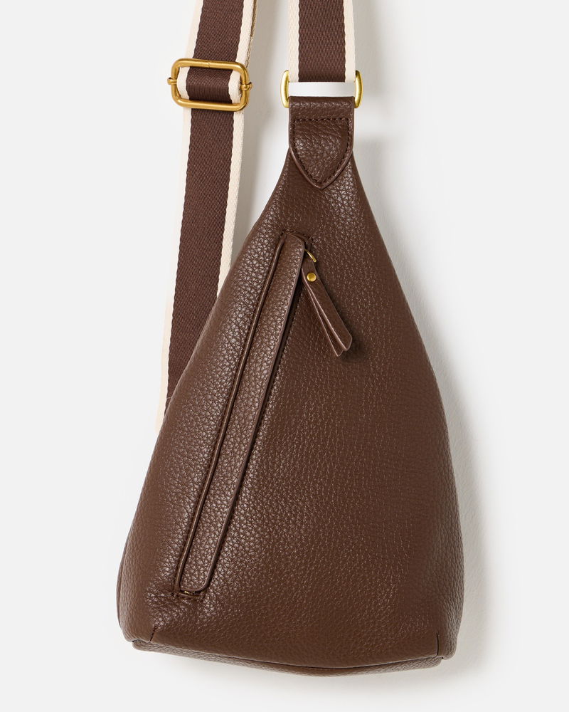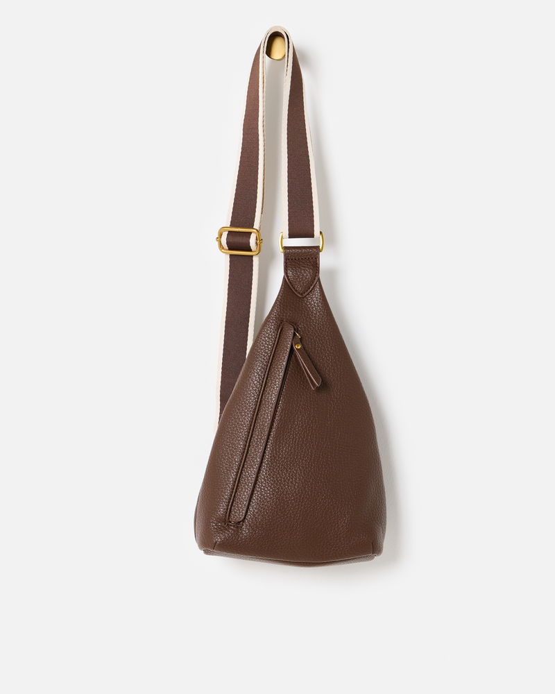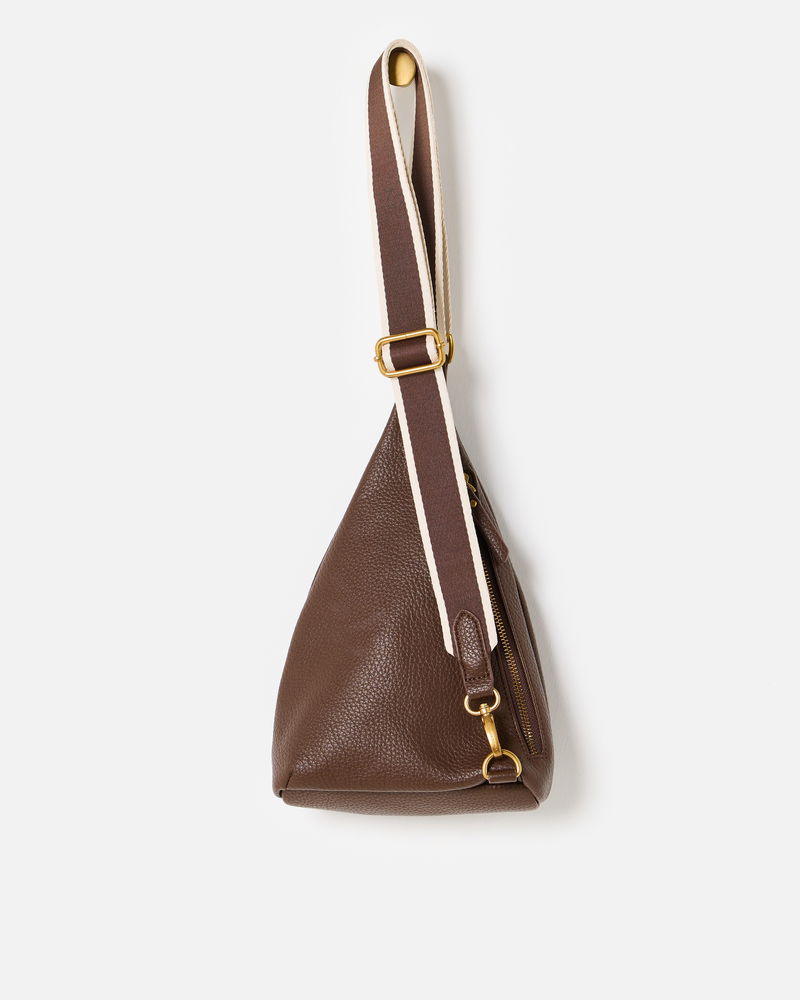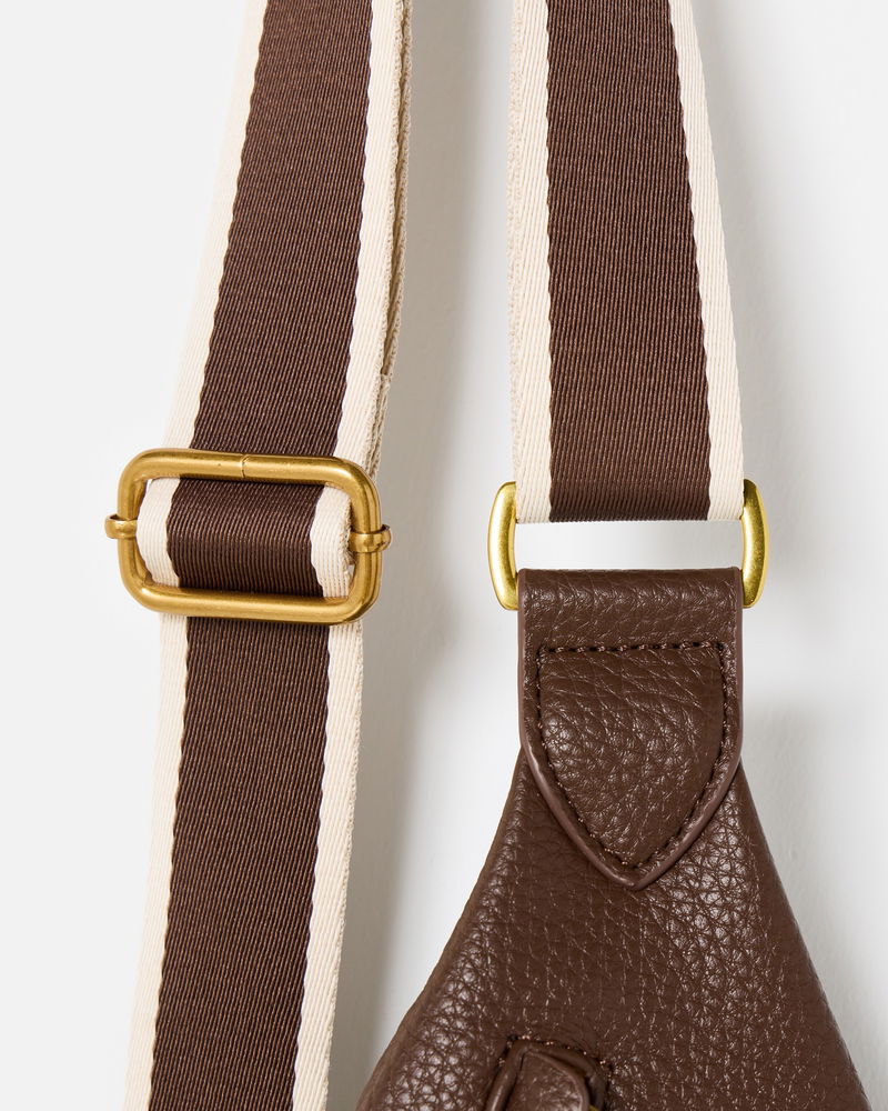 Designed with a heavy grain finish, it features gold hardware, an adjustable brown and cream striped crossbody strap for hands-free wearability (you're welcome), and two zipped pockets for easy on-the-go access. It's your go-to everyday bag ready to carry your daily essentials.