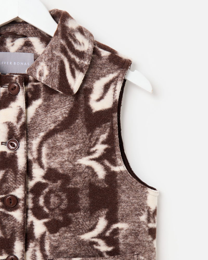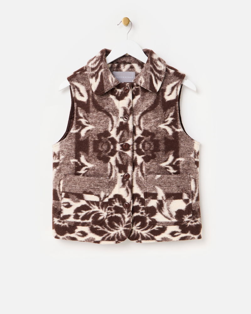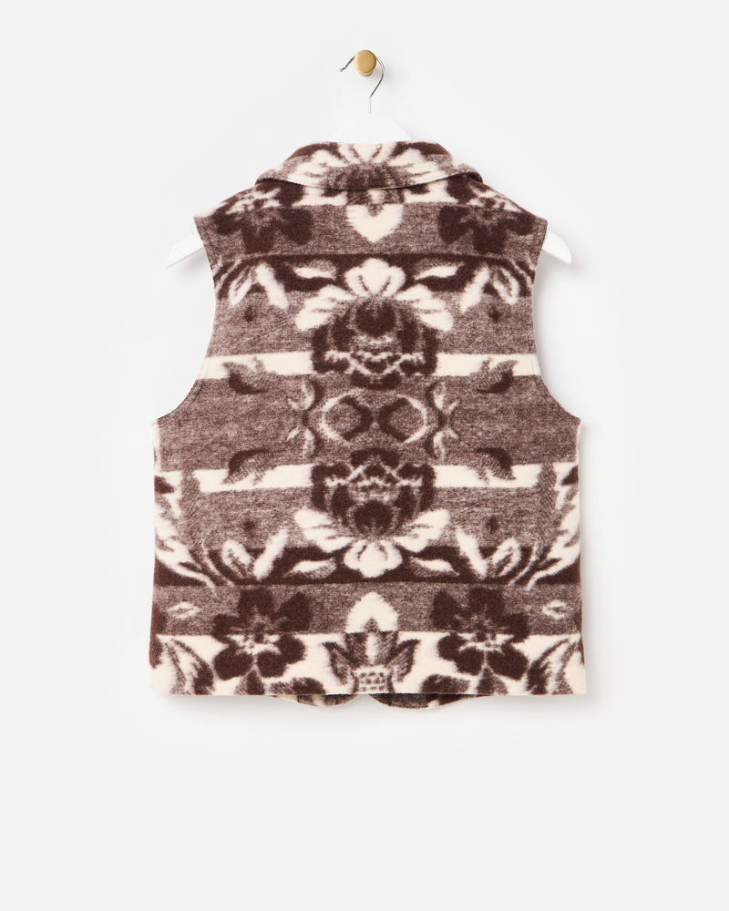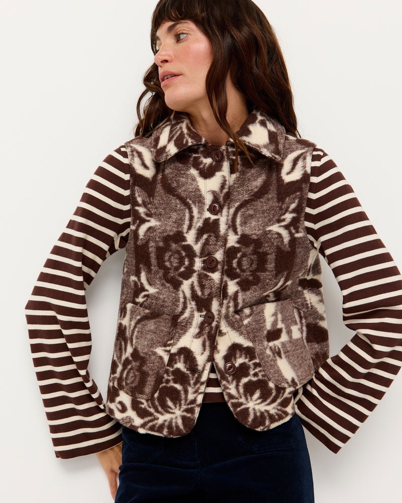 We've designed our wool blend gilet in a tonal chocolate brown and cream floral pattern, reminiscent of a classic blanket design. Complete with a collared neckline, handy front pockets and matching brown buttons down the front, layer over your everyday outfit for extra warmth without compromising on style.