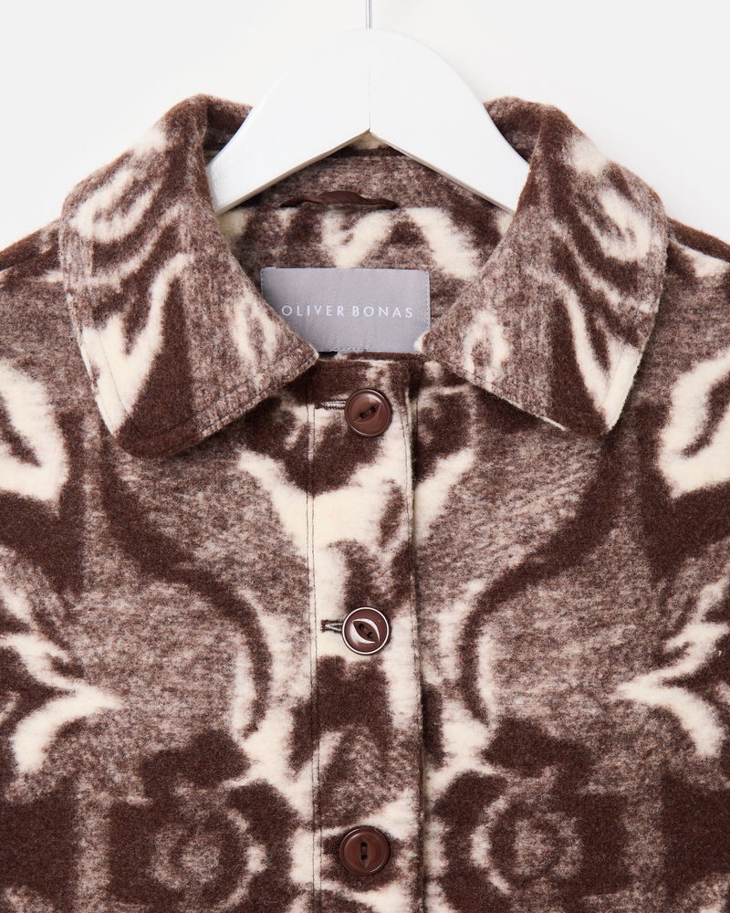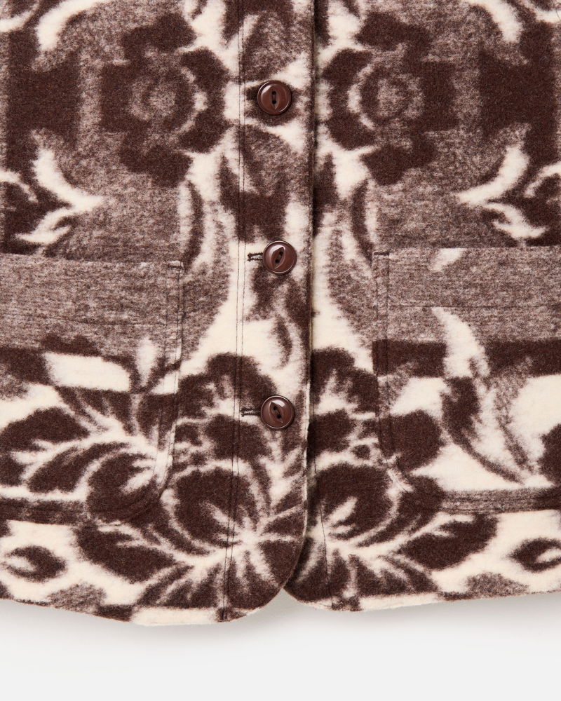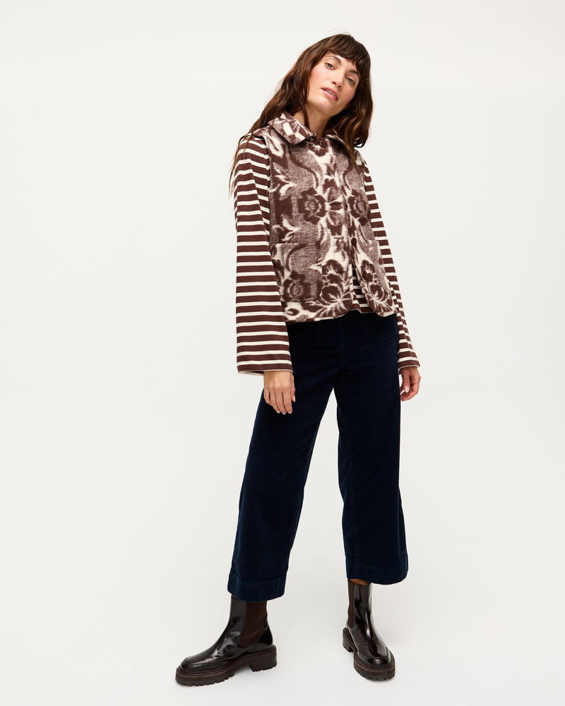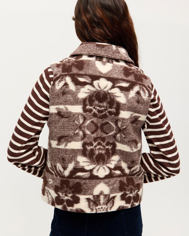 We've designed our wool blend gilet in a tonal chocolate brown and cream floral pattern, reminiscent of a classic blanket design. Complete with a collared neckline, handy front pockets and matching brown buttons down the front, layer over your everyday outfit for extra warmth without compromising on style.