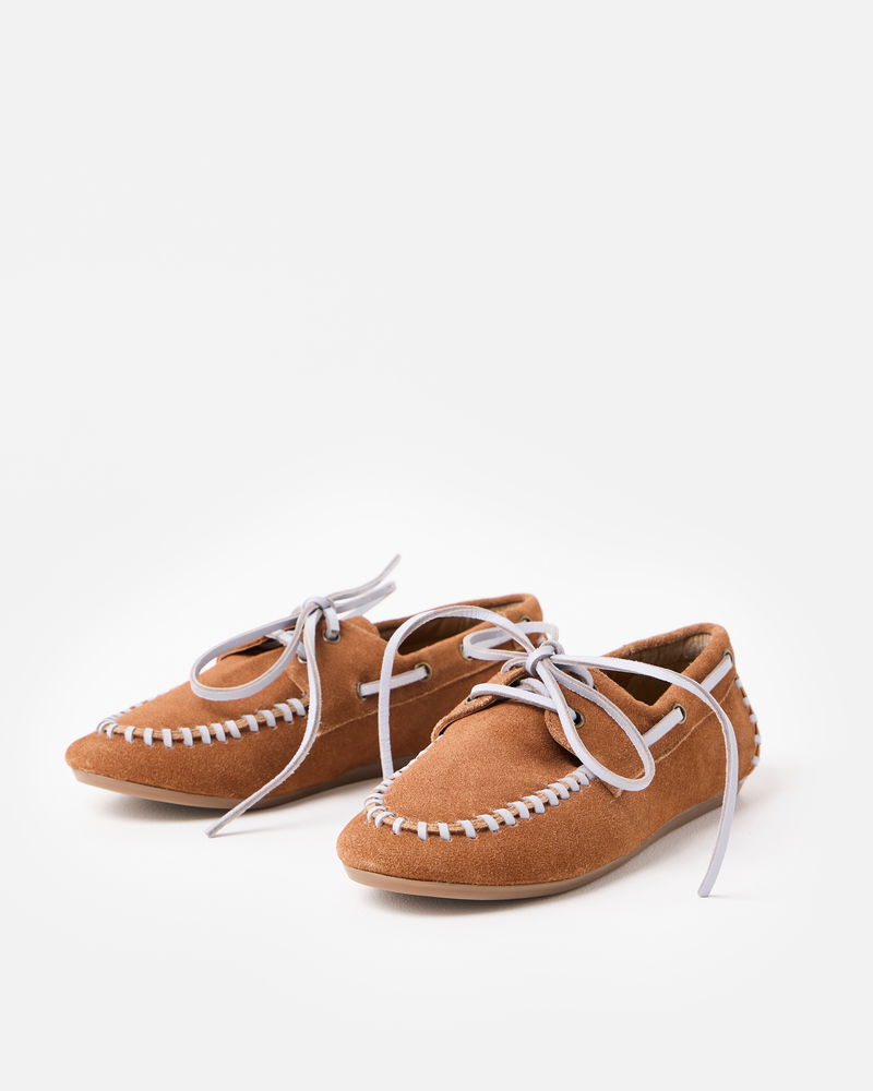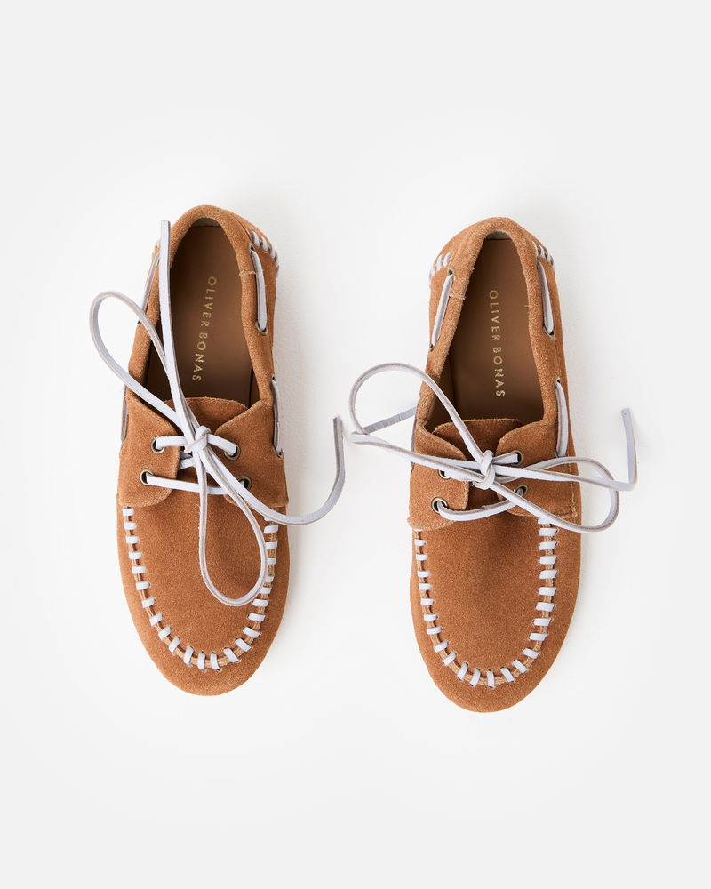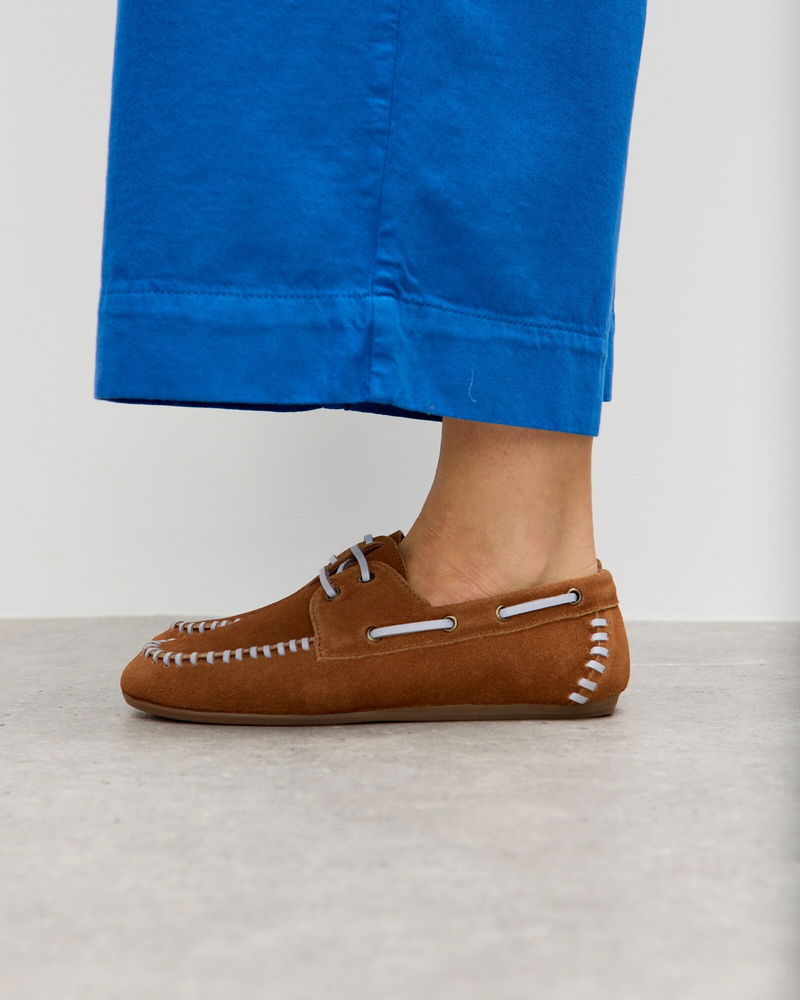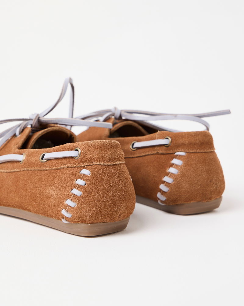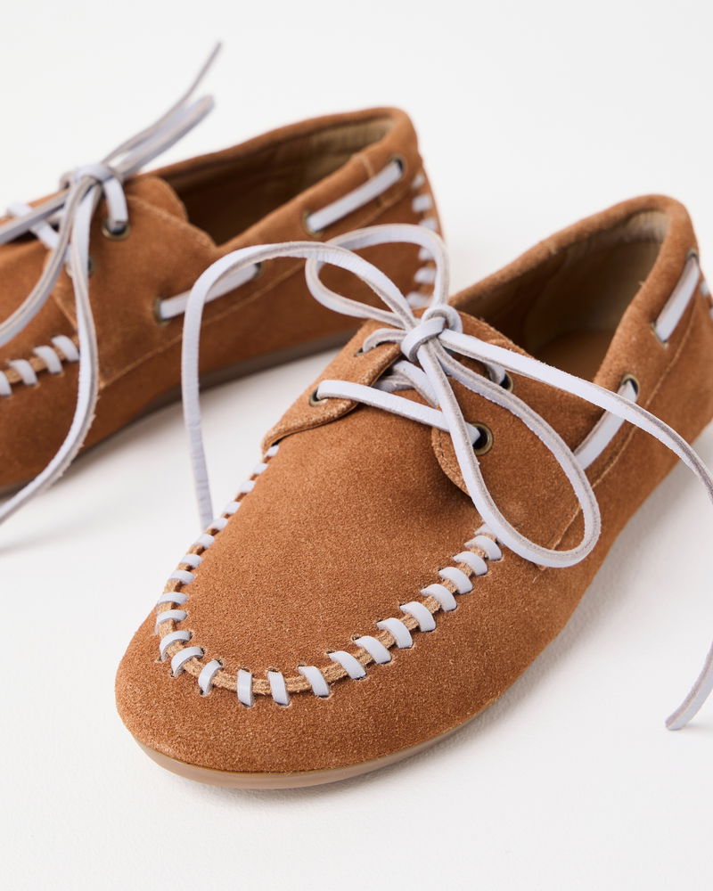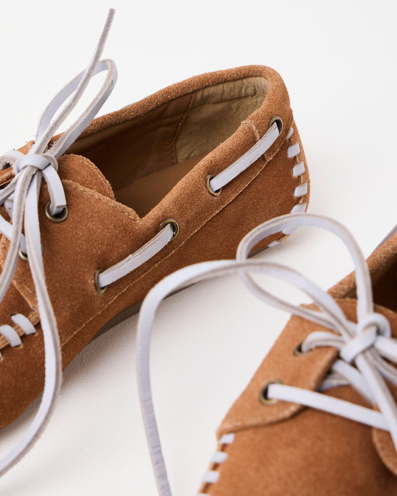 Made from suede leather in a tan brown shade, we've designed our loafers in a classic boat shoe style with contrasting light blue lace detailing. Complete with a brown flat sole, the versatile design effortlessly pairs with relaxed denim for a casual, laid-back feel.