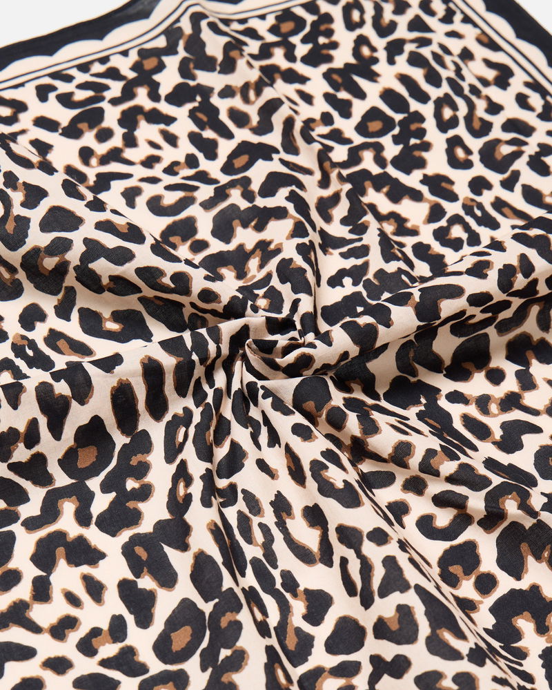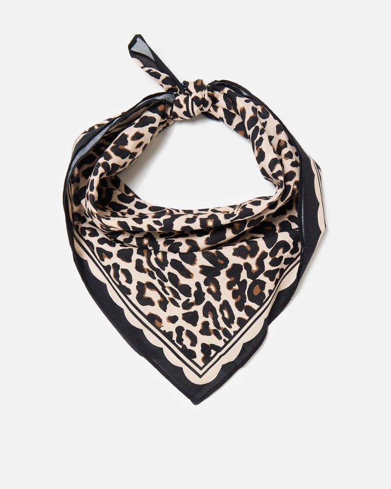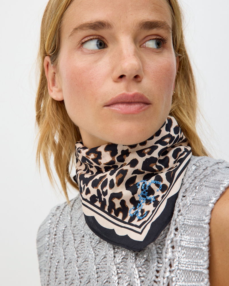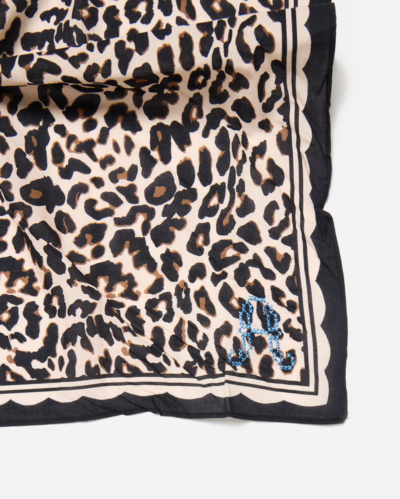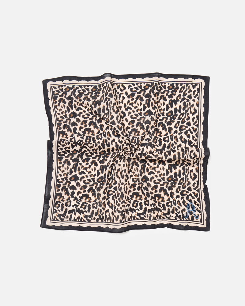 Looking to add a pop of animal print to your outfit? Make it personal with our alphabet animal print square scarf featuring your initial embroidered in a light blue thread. Framed with a black scalloped border, wear it as a headband or bag accessory or go full Francaise and fashion it as a neckerchief (ooh la la...).