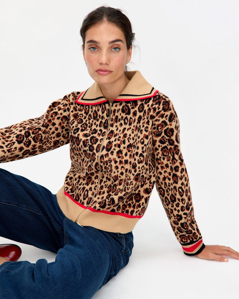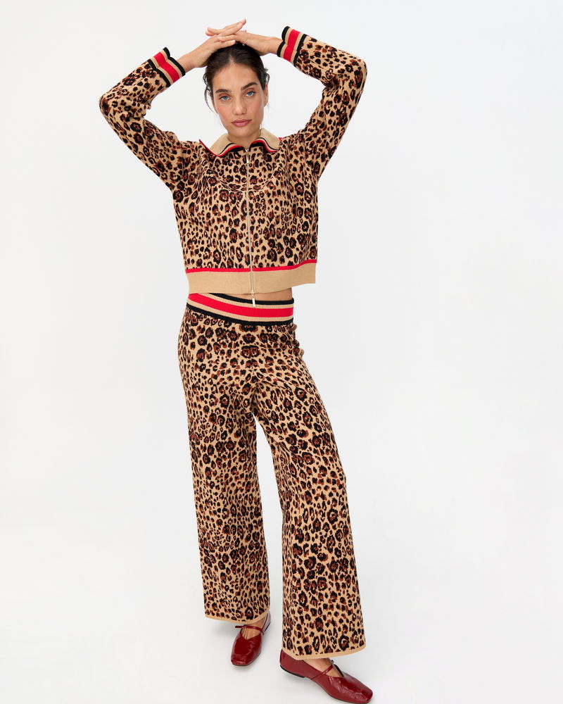 Blending comfort with standout style, our tonal brown leopard print bomber jacket is the perfect layer to your everyday outfits. Designed with a gold zip down the front and a collared neckline, we've accented the ribbed trims with a contrasting red stripe. Style with the matching knitted wide leg trousers for a statement leopard print look. Part of a co-ord set. Pieces sold separately.