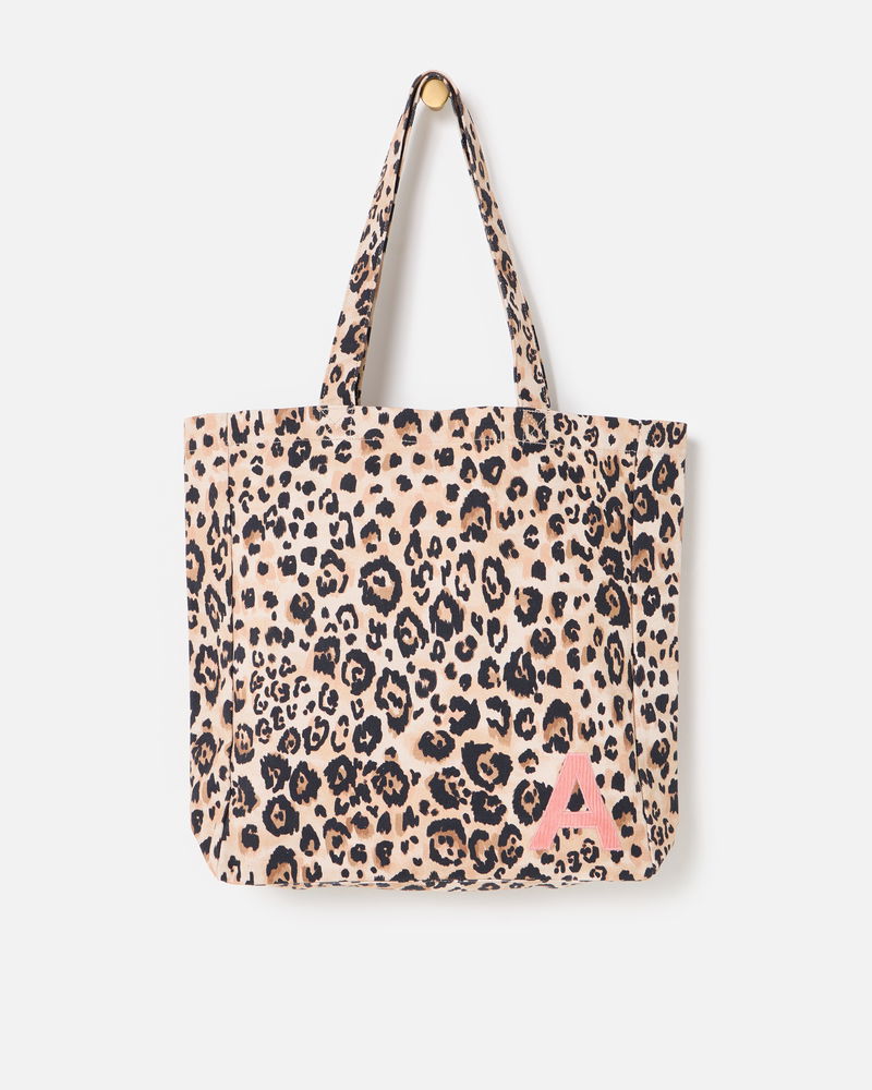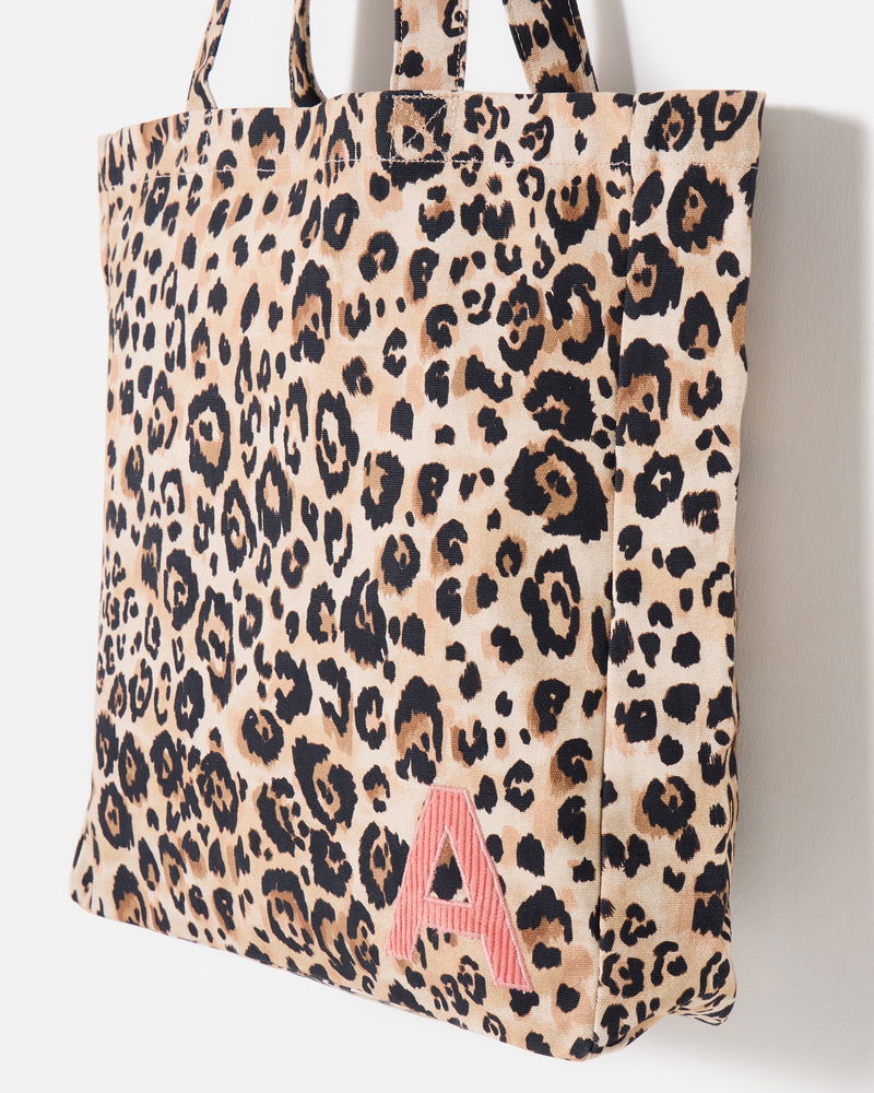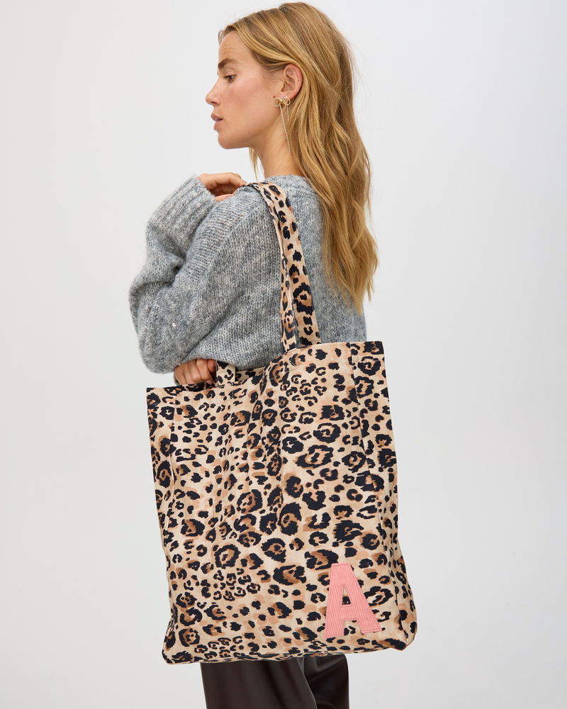 Love leopard print? Meet your new favourite everyday bag. In a tonal brown and black colourway, our tote bag has plenty of space for carrying your essentials. Designed with matching shoulder handle and an interior pocket, we've accented the bottom corner with your initial made from pink corduroy (because we're all about those extra details). It's ready for every plan you've got. Sling on your shoulder and go.