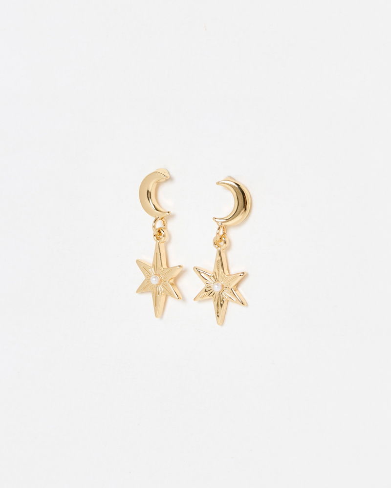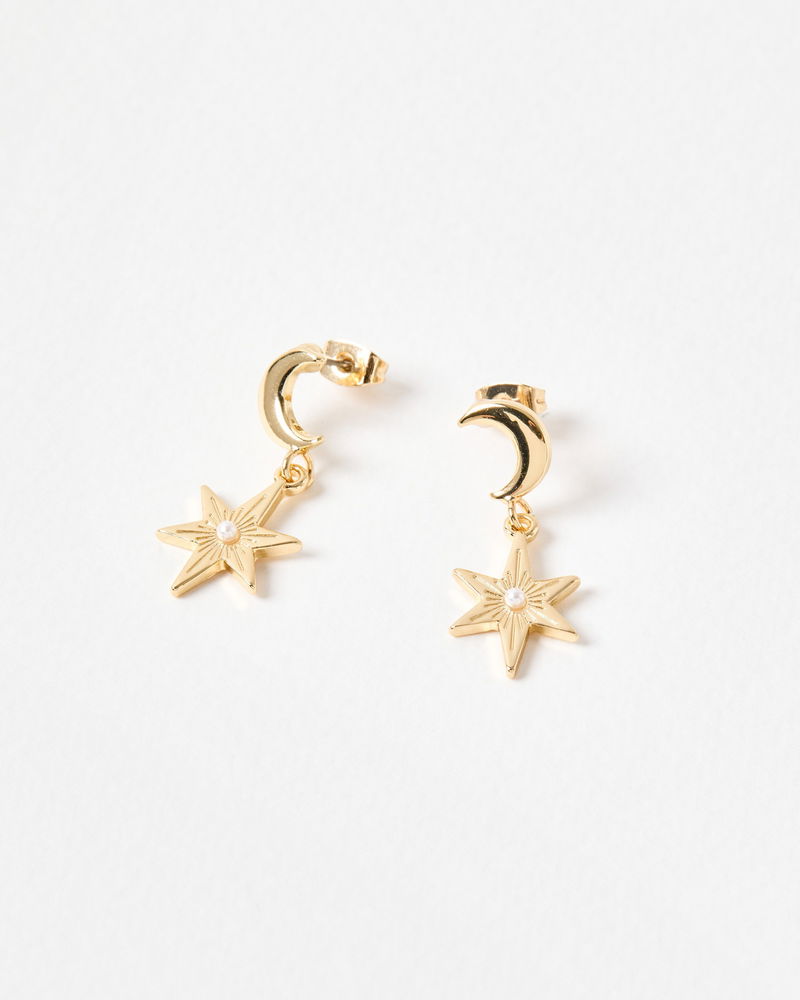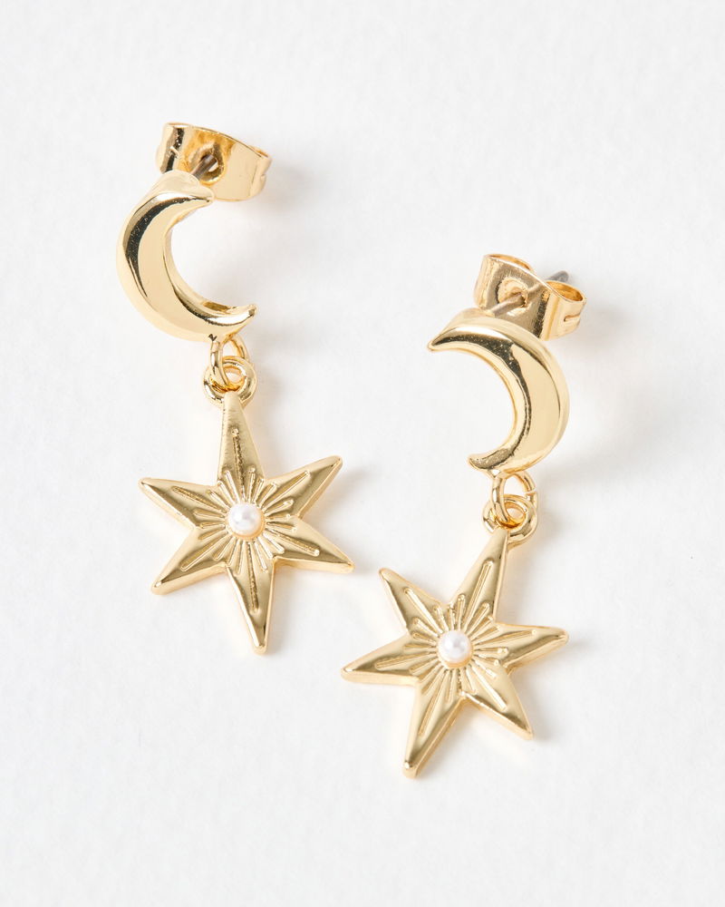 Add a touch of celestial charm with these gold-tone drop earrings, featuring dangling moon and star motifs. Each star is finished with a delicate faux pearl in the centre, making them perfect for parties.