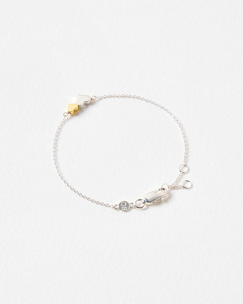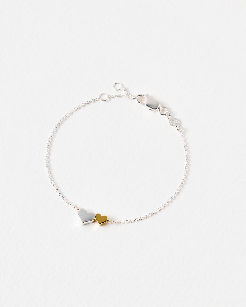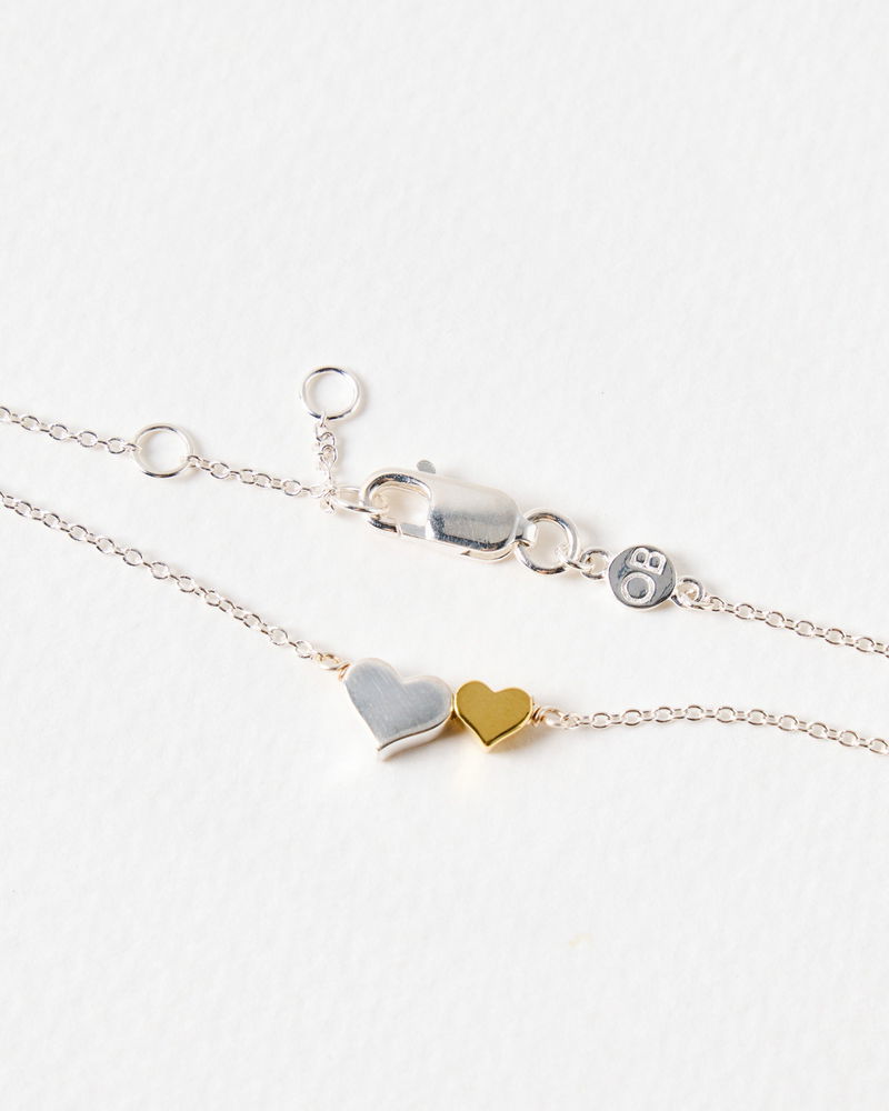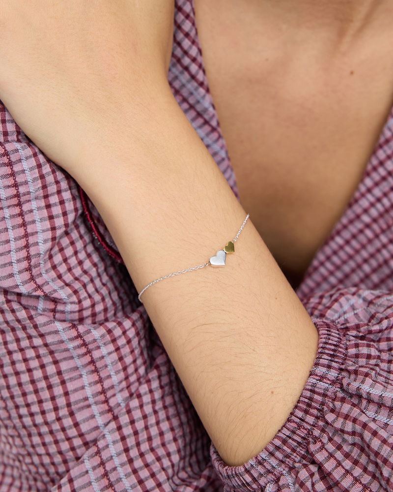 Mix your metals with this dainty silver chain bracelet. We've added two small heart charms, one plated in a shiny sterling silver and the other in 10k gold.