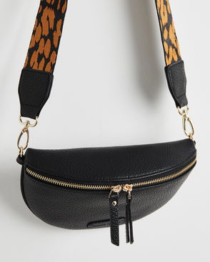 Black sling handbag in a slouch, curved shape with gold hardware. Designed with twisted knot detailing on the strap and a loop keyring.