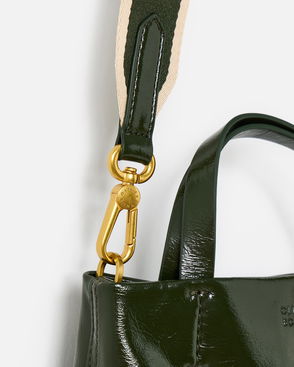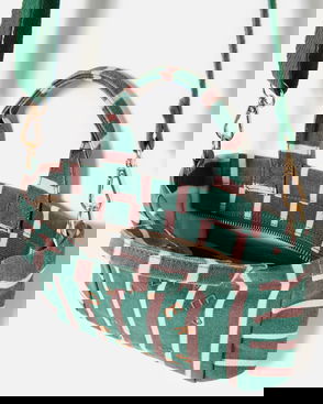 In a matte khaki green fabric, the Cammie weekend bag has both shoulder and a crossbody striped straps with metallic details, black hardware and contrasting lining.