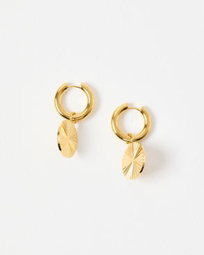 Gold tone huggie hoop earrings with a triangular purple charm and nugget border.