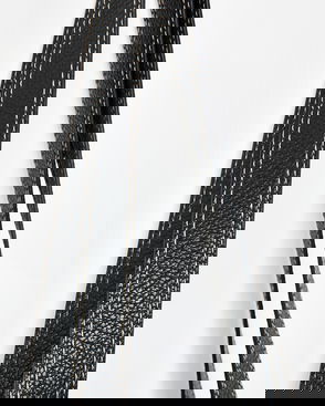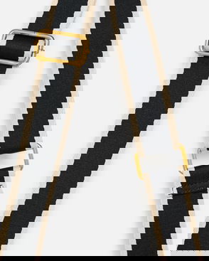 Black crossbody bag with a striped metallic strap, fold over fastening and exterior zipped pocket.