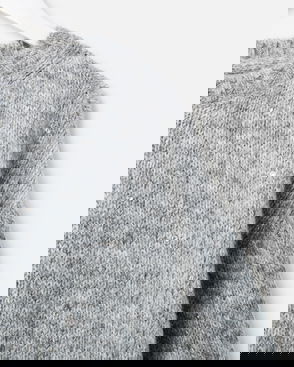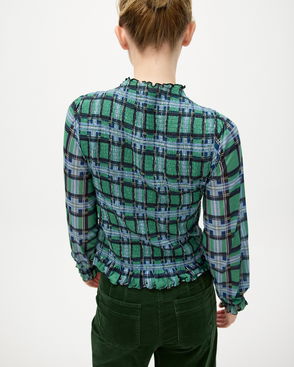 Cream short sleeve knitted top in a green checked pattern with a fluffy blue yarn detail on the corners of the grid. Designed with a collared neckline and three matching green buttons in a pearlescent finish.