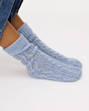 Sheer ankle socks knitted in a light blue checked pattern with cream sparkly trims.