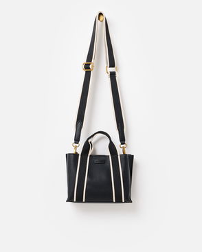 Cream crossbody bag strap woven in a black chevron design with gold hardware.