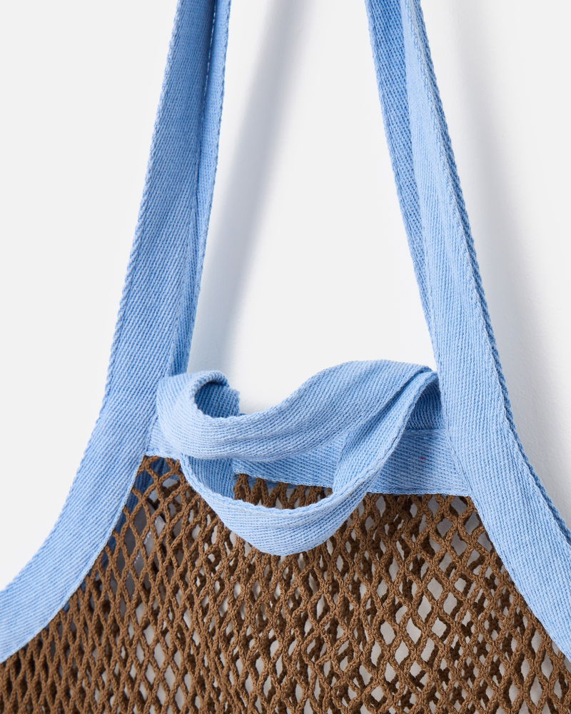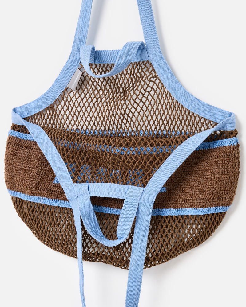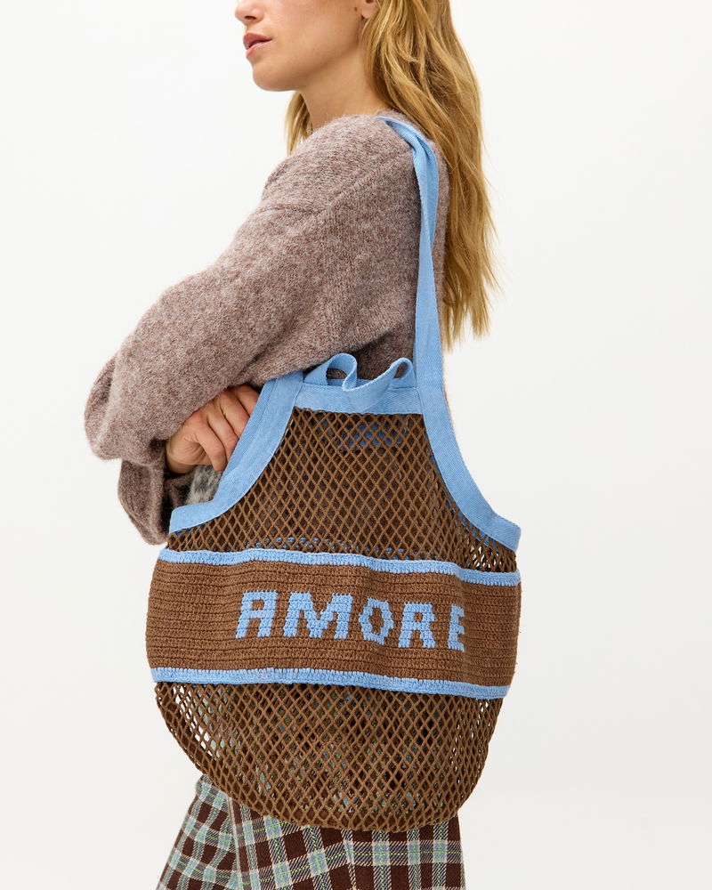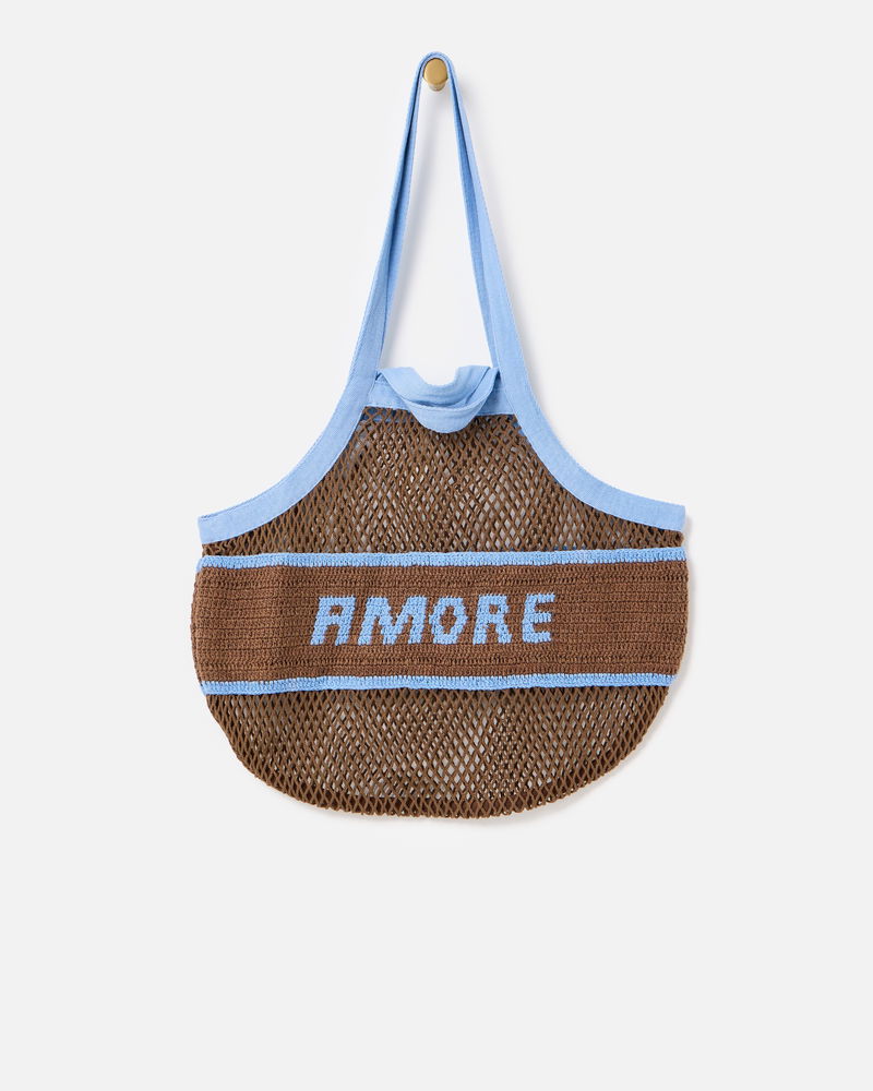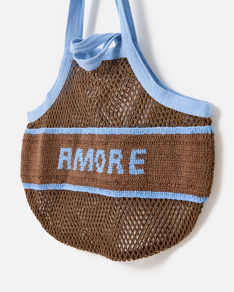 Designed with an open-weave net pattern using a traditional macrame knotting technique, our chocolate brown cotton shopper bag features a crochet panel reading 'Amore' in light blue yarn. Complete with both long shoulder straps and short handles for multiple styling options (we know you like options), it's the ideal tote for carrying your essentials for everyday errands and market strolls.